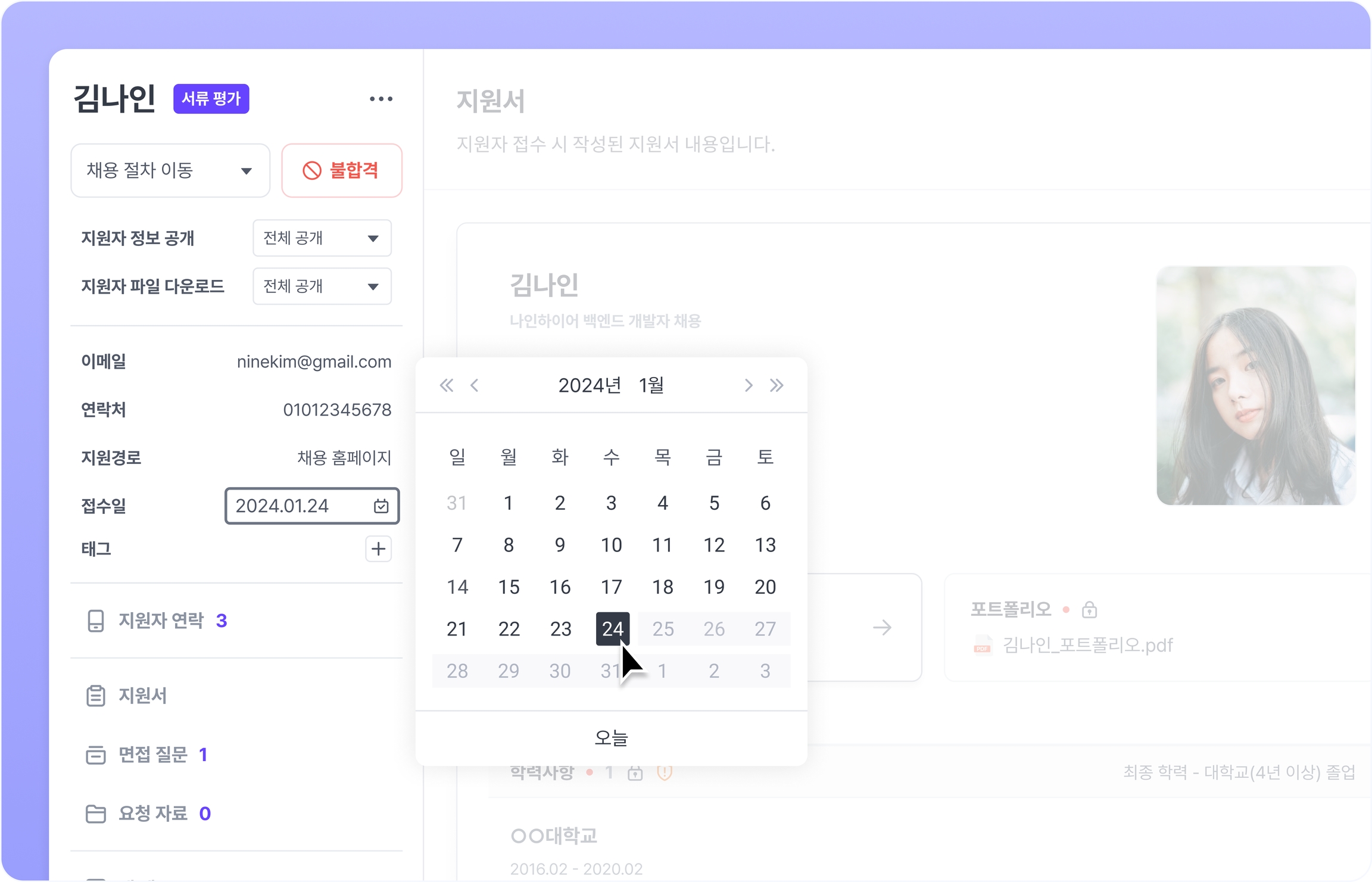 이제, 지원자의 접수일을 수정할 수 있어요. 다이렉트 소싱이나 이메일 지원 등으로 지원자를 직접 추가할 때도 정확한 접수일을 반영하여 계산된 리드타임을 확인해 보세요. 지원자 접수일은 지원자 상세 화면에서 손쉽게 변경할 수 있습니다.