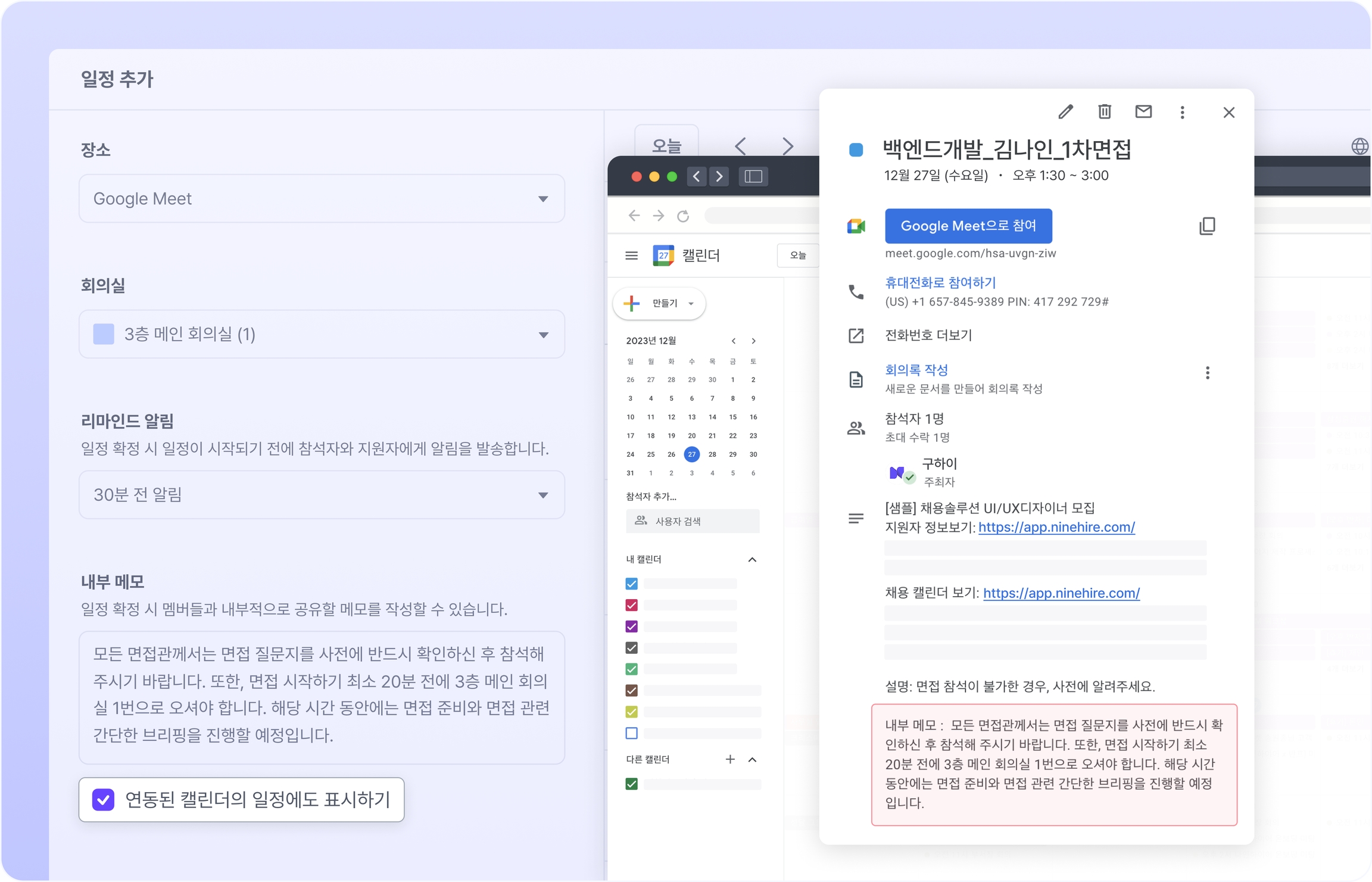 일정 확정 시에 멤버들과 내부적으로 공유할 내용인 내부 메모를 일정 내보내기 캘린더에서 확인하고 싶으시다면 표시 옵션을 사용해 보세요. 일정 참여자분들이 개별적으로 연동된 캘린더에서 일정에 관한 상세한 정보를 확인할 수 있습니다.