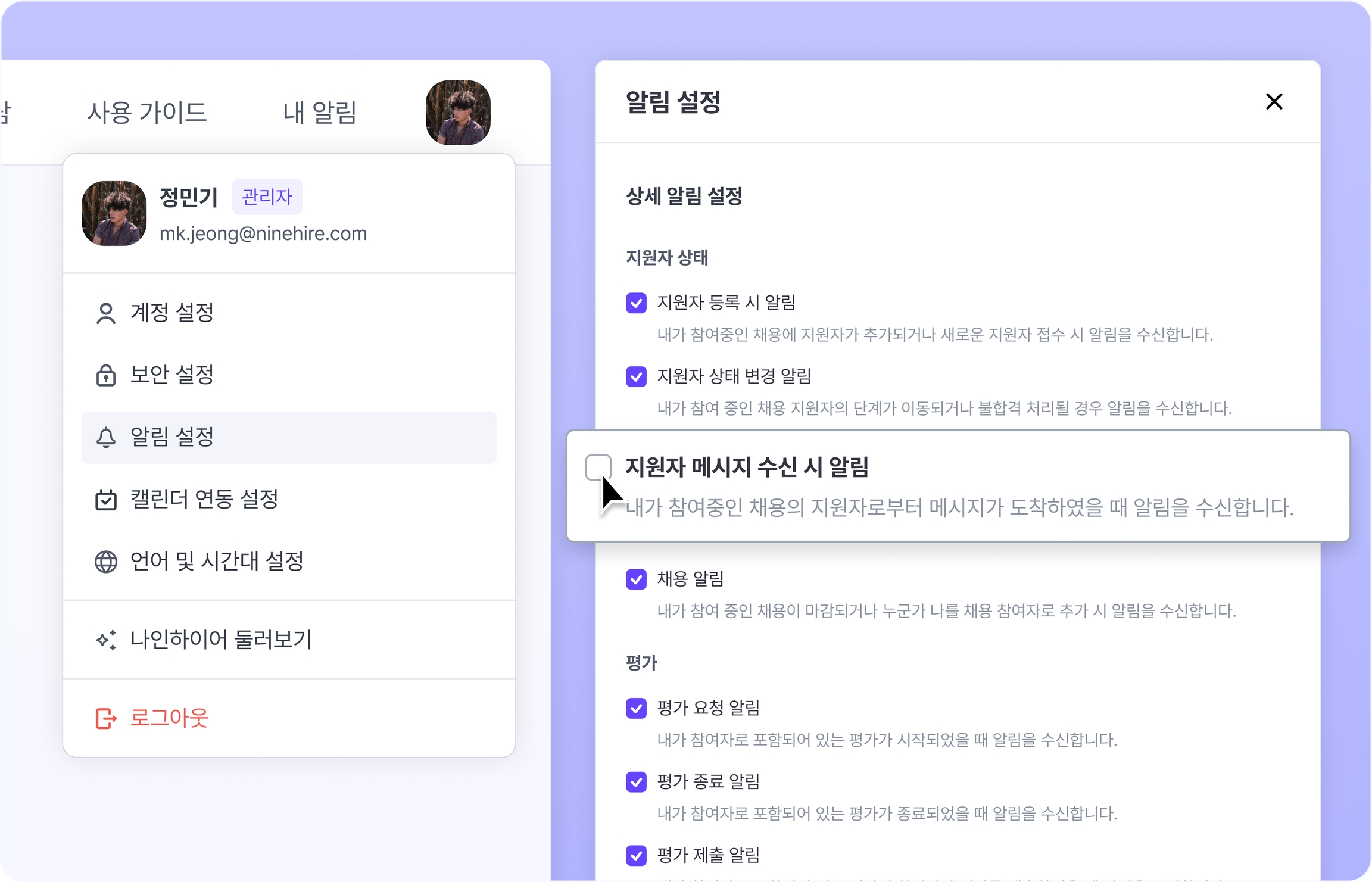참여 중인 채용에서 지원자로부터 메시지가 도착했을 때 알림을 받을지 여부를 선택할 수 있는 새로운 옵션이 추가되었어요. 각 멤버는 개별적으로 이 옵션을 켜거나 끌 수 있으므로, 자신의 역할에 맞게 필요한 알림만 선택해 받아볼 수 있습니다.