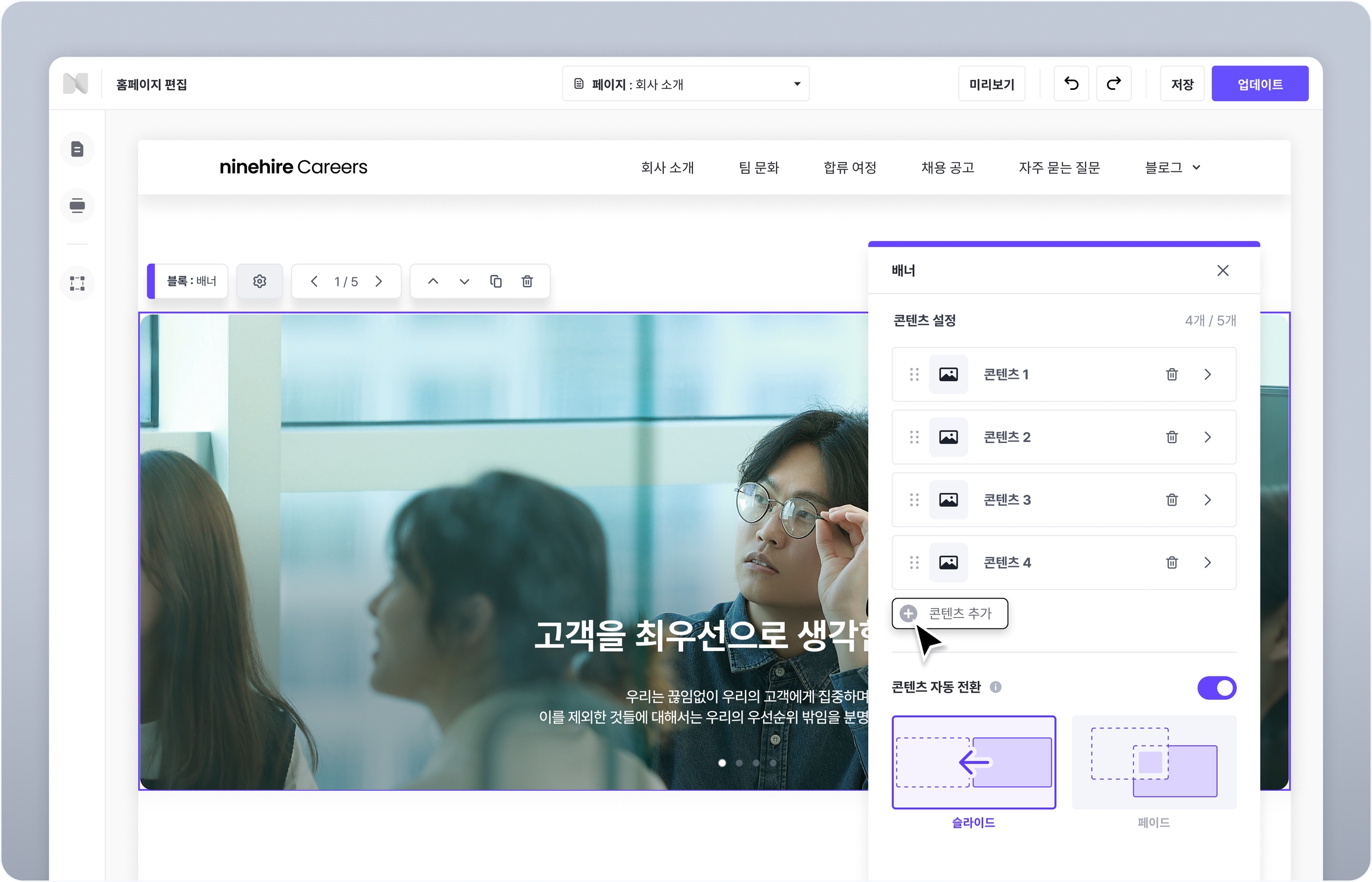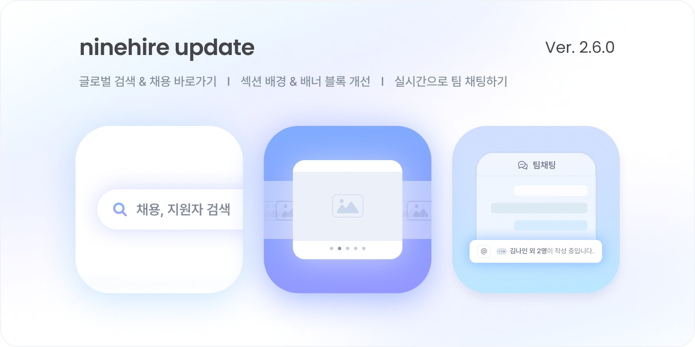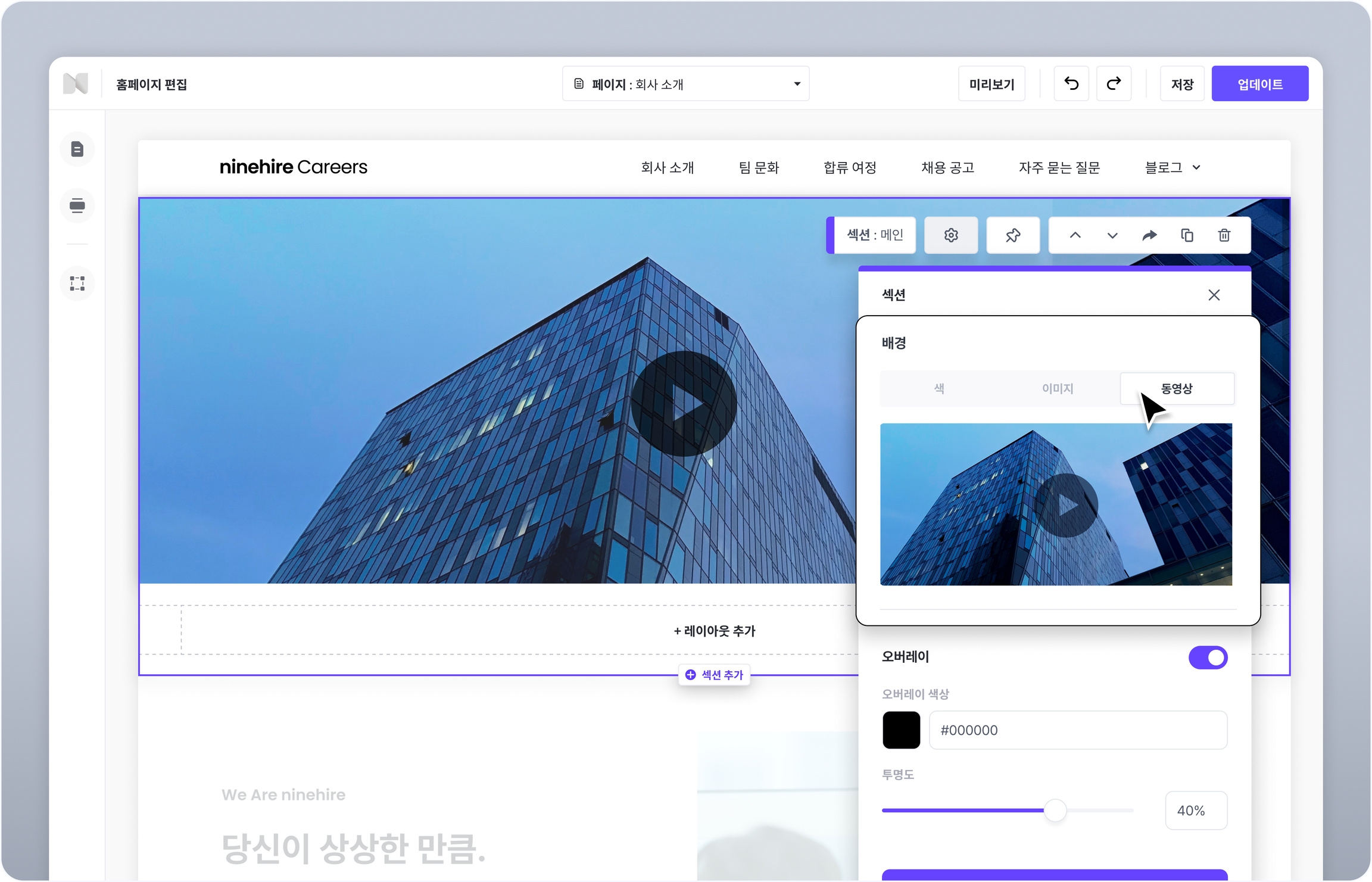 나인하이어의 채용 홈페이지 빌더는 채용 트렌드를 반영해 디테일을 더해가는 업데이트가 계속되고 있어요! 이번 업데이트에서는 이미지와 동영상을 더욱 효과적으로 활용할 수 있는 기능들이 추가되었어요. 나인하이어와 함께라면 쉽고 빠르고 완벽하게 채용 홈페이지를 제작할 수 있습니다.