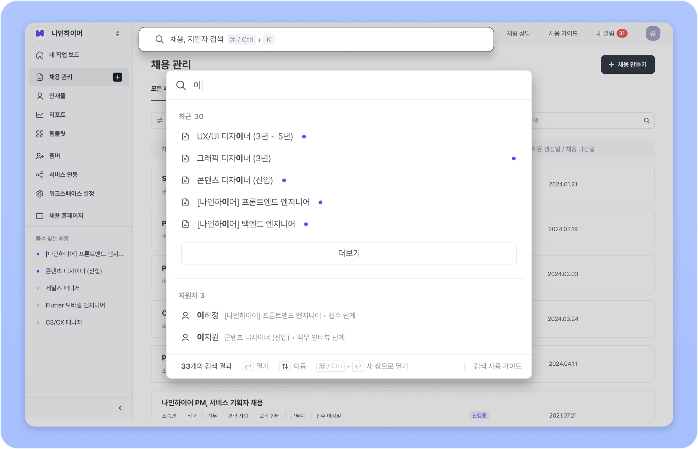 서비스 상단을 클릭해 검색창을 띄울 수 있지만, 단축키 Ctrl+K(윈도우), Cmd+K(맥)로도 검색창을 불러올 수 있어요. 채용은 채용 제목으로, 지원자는 이름, 이메일, 연락처로 검색할 수 있고, 검색 결과는 사용자의 권한에 따라, 채용 및 지원자에 대한 열람 권한이 있는 경우에만 표시됩니다.