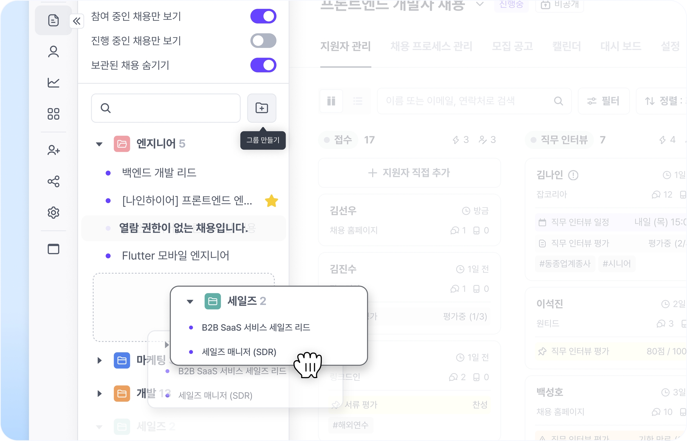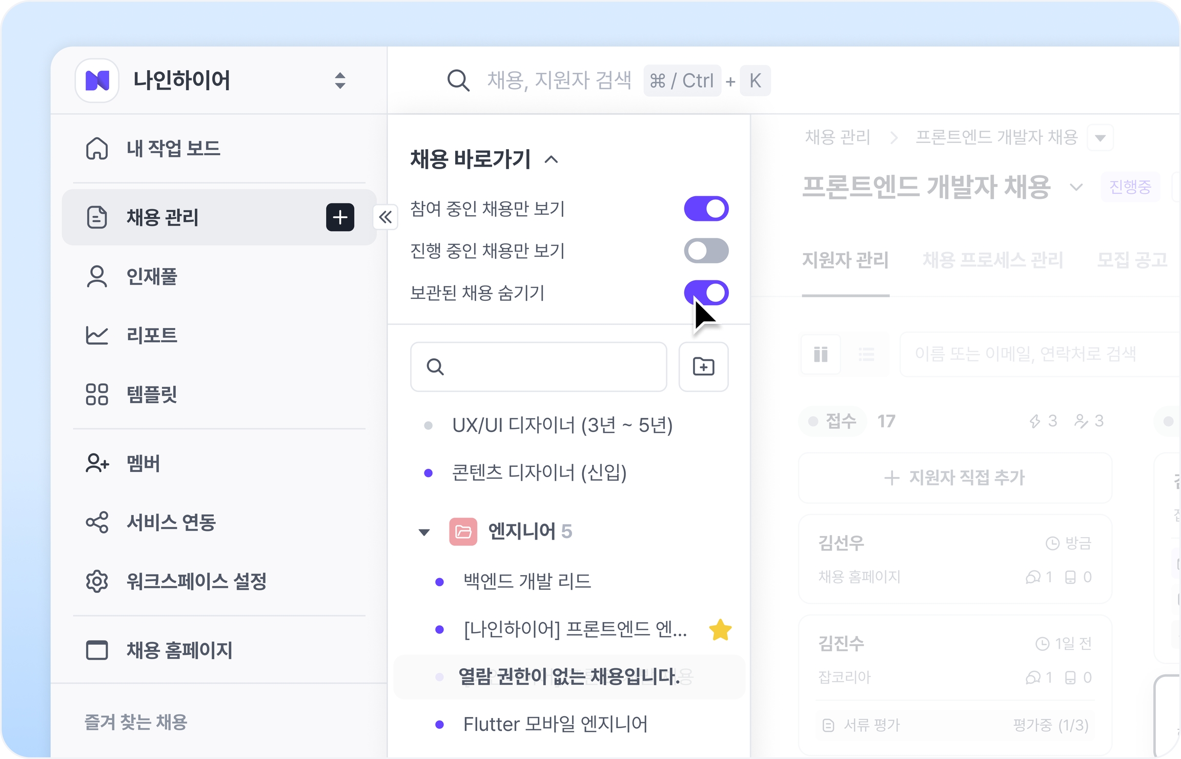 필요한 채용을 쉽게 찾고 빠르게 이동할 수 있도록 ‘채용 바로가기’ 기능이 새롭게 추가되었어요. 채용 바로가기 는 좌측 사이더의 옆에 위치한 패널로 검색, 필터, 그룹 등 다양한 기능을 통해 채용별 접근성을 크게 높였습니다.
