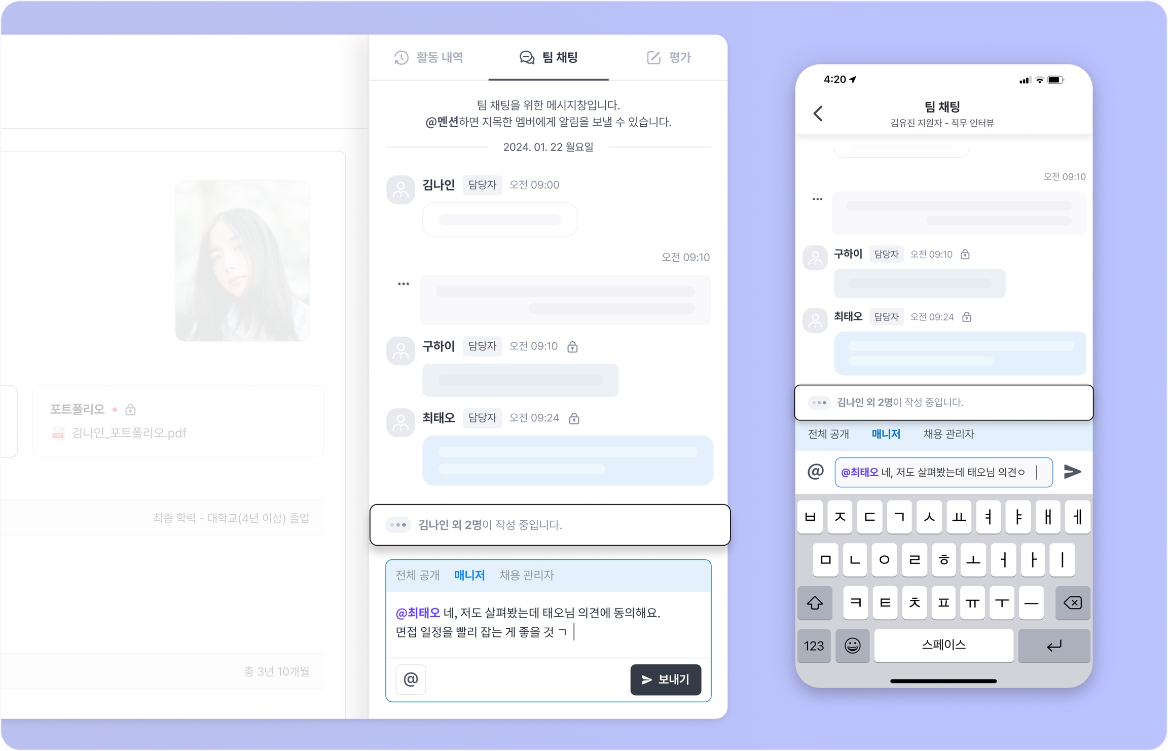기존에는 팀 채팅에 메시지를 입력할 때, 다른 멤버들의 채팅창에 그 내용이 나타나기 위해 새로고침이 필요했지만, 이제는 실시간으로 반영됩니다. 또한 다른 멤버가 팀 채팅에 글을 작성하는 중인지도 실시간으로 확인할 수 있어요.