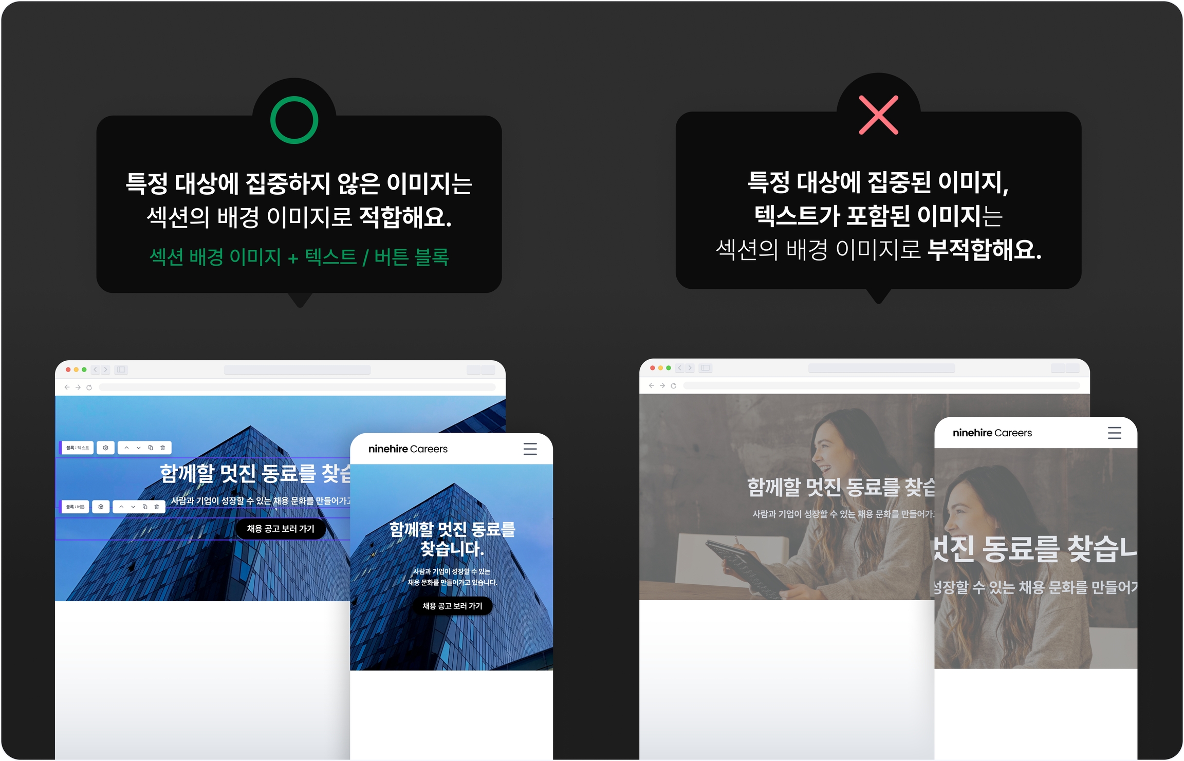 섹션 배경의 이미지는 사용자 화면의 가로 너비에 맞춰 꽉 차게 표시됩니다. 이미지의 높이는 그대로 유지되지만, 화면의 가로 너비에 따라 이미지의 좌우가 잘려 보일 수 있어요. 그래서 이미지의 좌우에 여유 공간을 두거나 특정 대상에 집중하지 않은 이미지를 사용하는 것을 권장드립니다. 또한, 텍스트가 포함된 이미지도 섹션 배경으로 적합하지 않으니, 텍스트 블록을 추가하여 사용해 주세요!