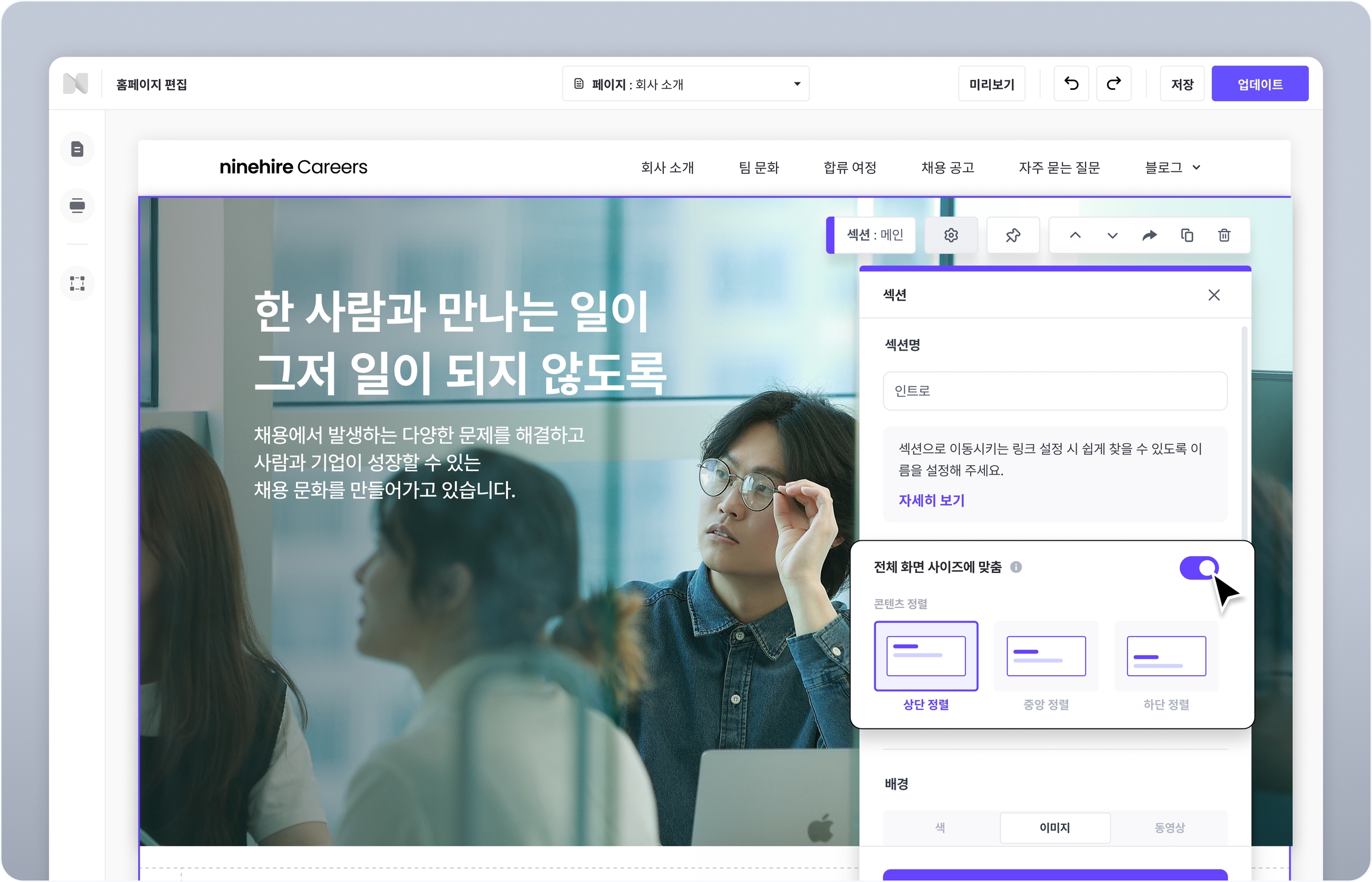 섹션에 ‘전체 화면 사이즈 맞춤’ 옵션이 새롭게 추가됩니다. ‘전체 화면 사이즈 맞춤’은 섹션의 최소 높이를 사용자 화면 크기에 맞추는 기능이에요. 이 옵션은 채용 홈페이지의 최상단 섹션에서 사용하는 것을 권장드려요.