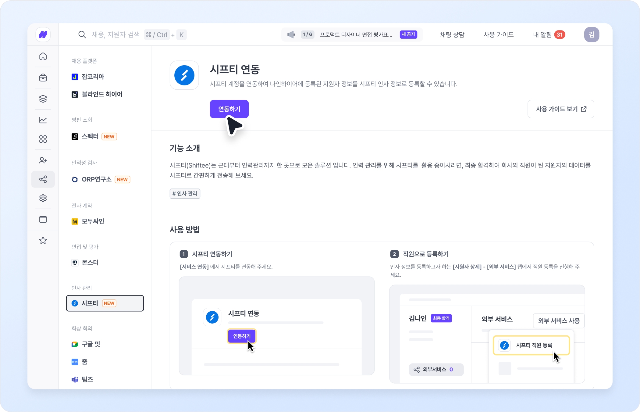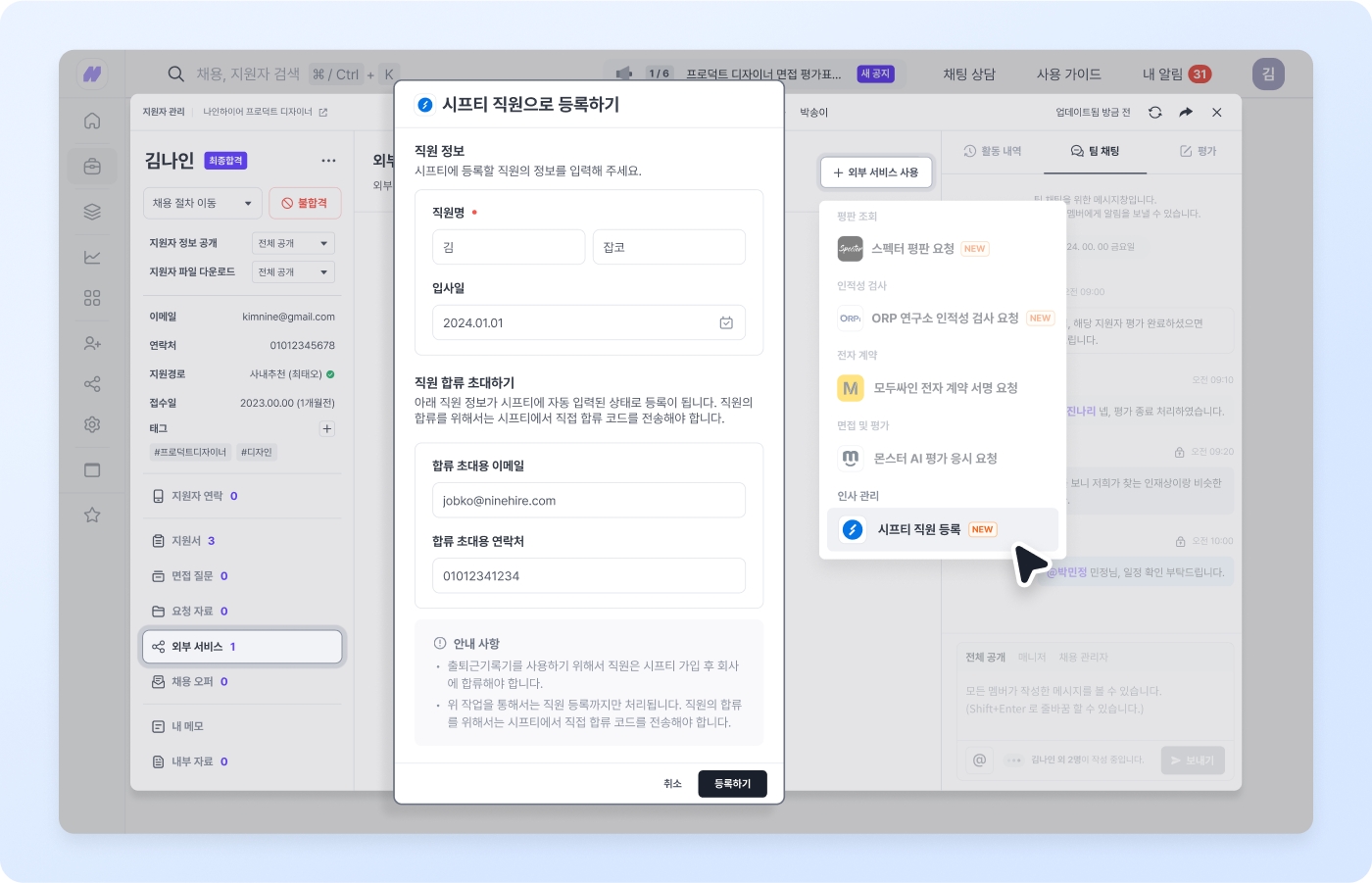 서비스 연동이 완료되면, 이제 개별 지원자(합격자)의 데이터를 손쉽게 시프티에 전송할 수 있습니다. 지원자 상세 보기 > 외부 서비스 에서 [+ 외부 서비스 사용] 을 클릭하여 시프티 직원 등록을 시작하세요. 이때 시프티에 등록될 지원자의 직원 정보와 메모를 입력할 수 있으며, 지원자에게 시프티 합류 초대 코드를 자동으로 발송하여 빠르게 합류 절차를 진행할 수 있습니다.