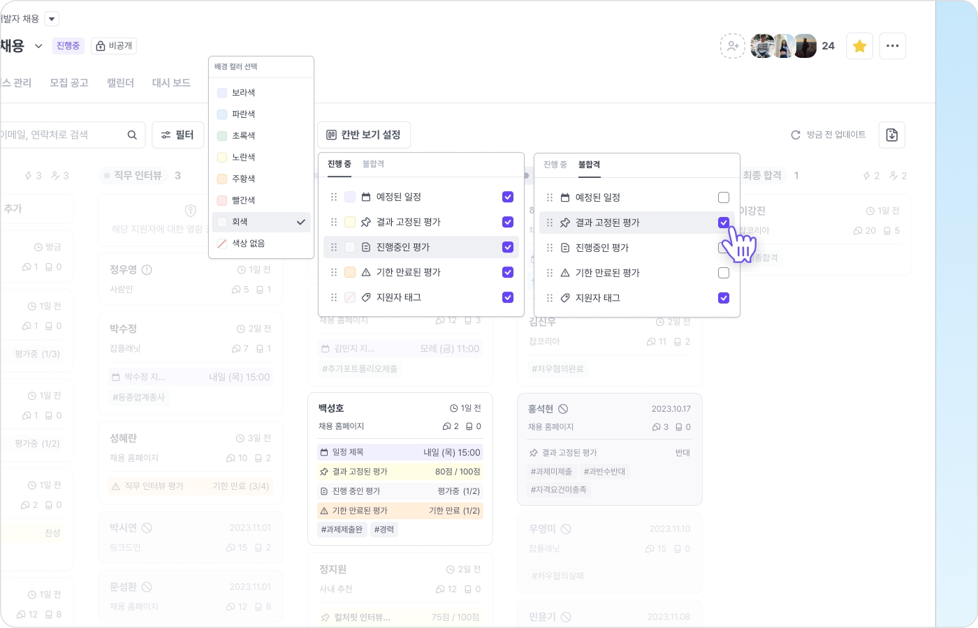 채용 관리자는 칸반 보드에 표시되는 항목들을 자유롭게 설정할 수 있습니다. 지원자 상태 (진행 중, 불합격) 에 따라 항목의 표시 여부, 색상, 그리고 순서를 원하는 대로 조정할 수 있으며, 이러한 설정은 모든 사용자에게 동일하게 적용되고, 채용 단위로 저장됩니다.