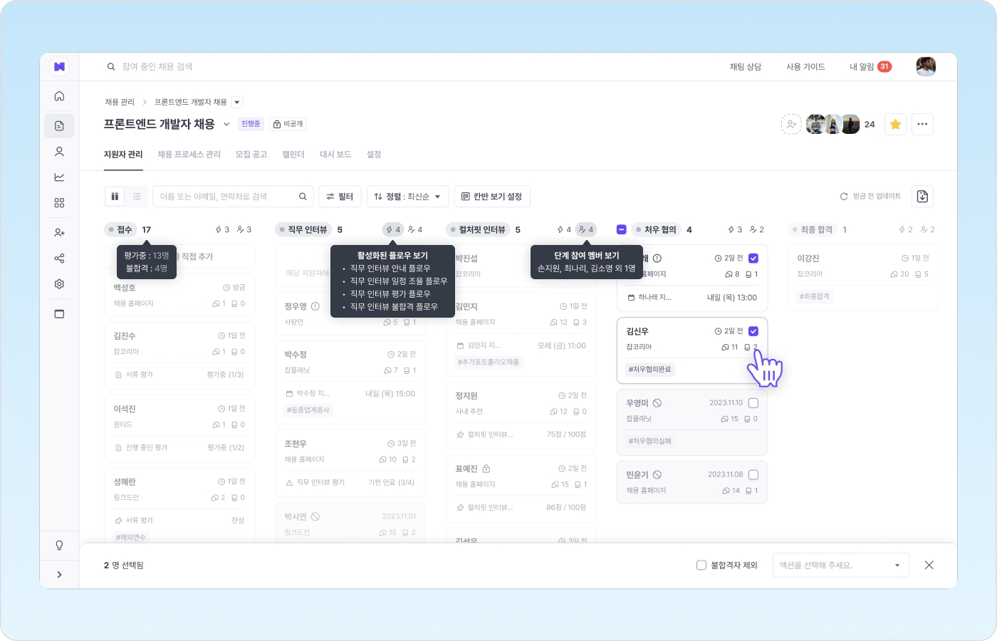 칸반 보드는 다양한 정보를 효과적으로 관리하는 데 도움을 주는 중요한 도구입니다. 이번 업데이트로 칸반 보드의 사용성을 개선하여 모든 정보를 더 쉽게 확인하고 커스터마이징을 통해 회사의 채용 프로세스에 맞게 조정할 수 있습니다.
