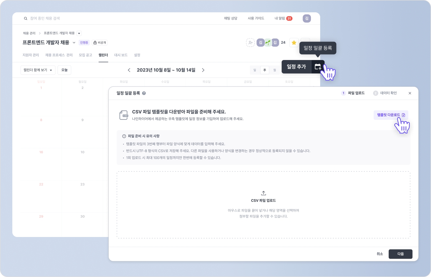 이제 여러 지원자의 일정을 캘린더에 한 번에 추가할 수 있습니다. 나인하이어에서 제공하는 템플릿을 활용하여 일정 정보를 손쉽게 작성한 후, 해당 일정에 맞춰 지원자와 참석자를 선택하면 일정 등록이 완료됩니다.