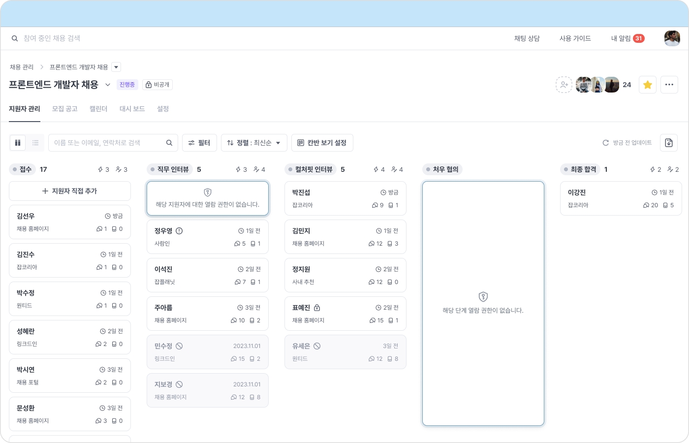 사용자의 권한에 따라 칸반 보드에서 볼 수 있는 지원자 정보가 변경되었습니다. 예를 들어, 특정 단계의 참여 권한이 없다면, 해당 단계의 지원자들은 칸반 보드에서 보이지 않게 됩니다. 또한, 개별 지원자에 대한 열람 권한이 없는 경우 해당 지원자의 정보는 숨겨진 상태로 표시됩니다.