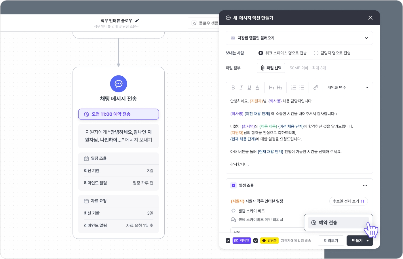 자동화 플로우 빌더에 메일 / 메시지 액션의 예약 기능이 추가되었습니다. 이를 통해 원하는 시간에 메일이나 메시지의 전송을 예약할 수 있습니다. 예약한 내용은 지원자 연락 내역에서도 확인할 수 있습니다.