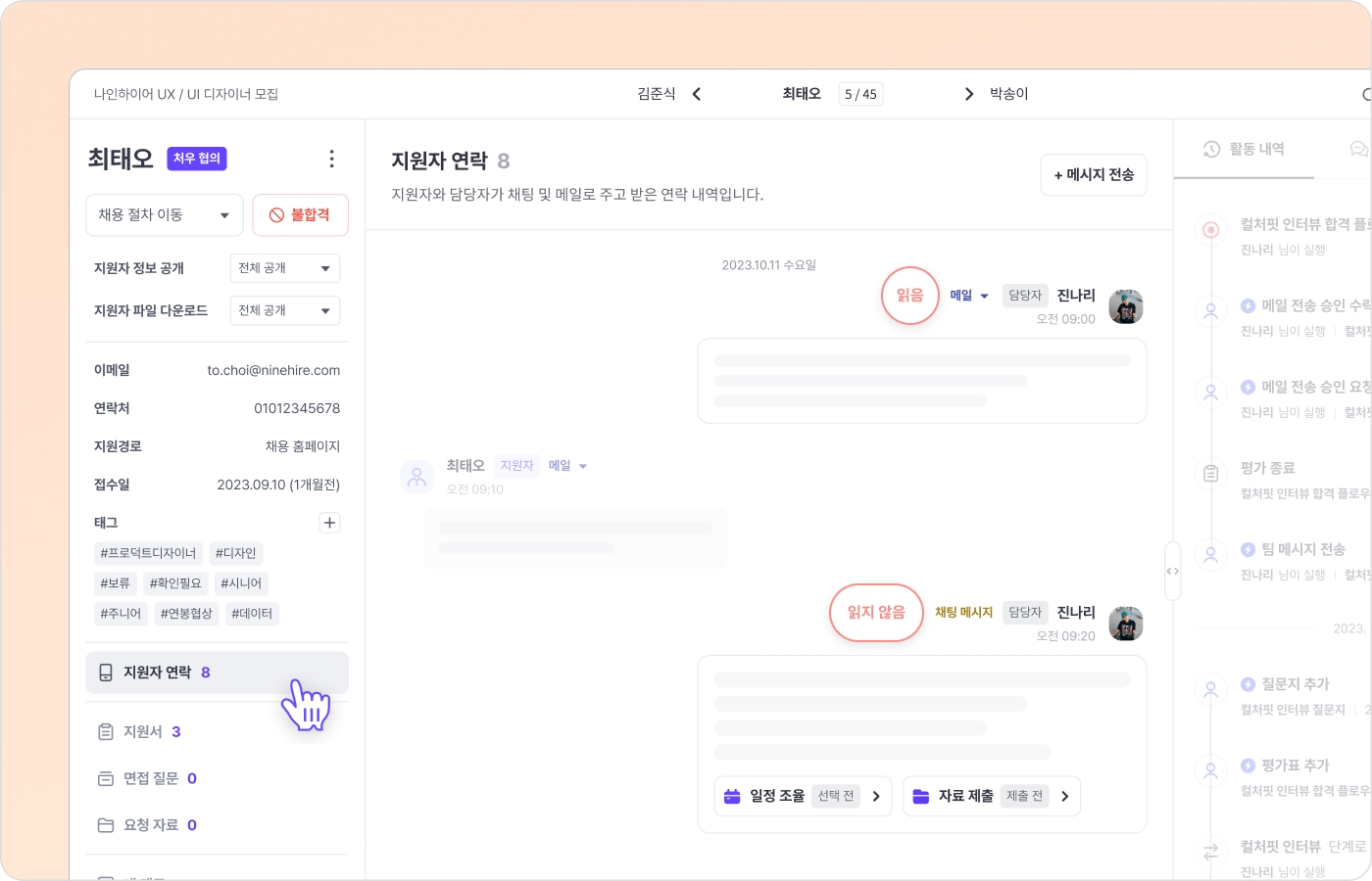 지원자에게 전송한 메시지나 메일의 전달 상황을 직관적으로 확인할 수 있는 기능이 추가되었습니다. 지원자가 메시지나 메일을 확인하면, 지원자 연락 내역에서 해당 메시지나 메일의 상태가 ‘읽지 않음’에서 '읽음'으로 변경되어 표시됩니다.