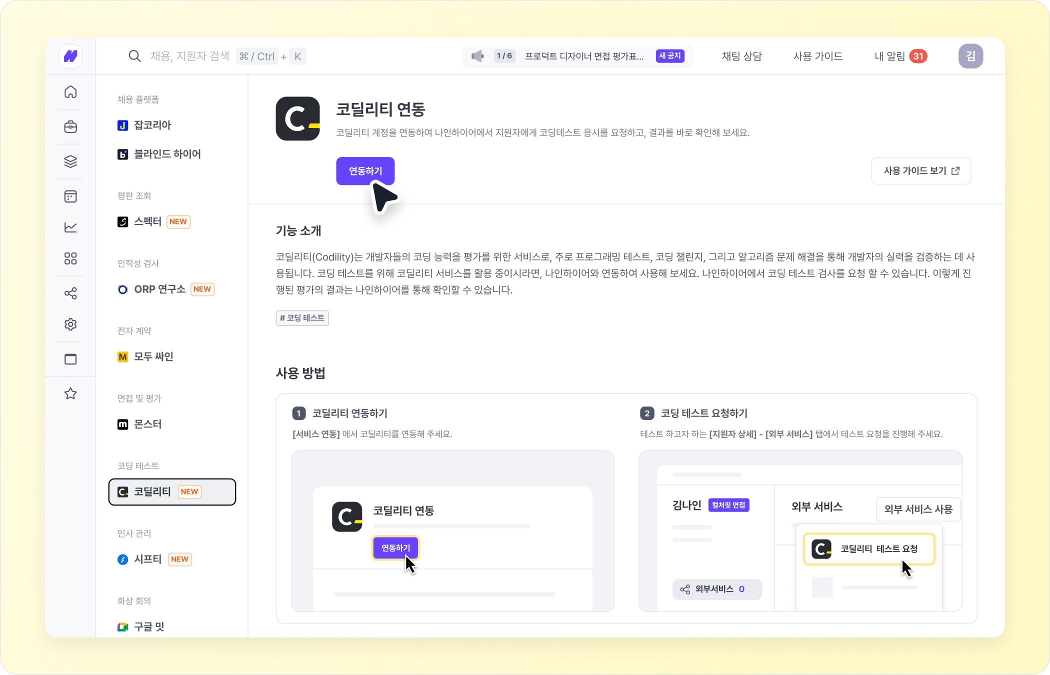 나인하이어에서 코딩 테스트를 진행하려면, 먼저 코딜리티 계정을 나인하이어와 연동해야 합니다. 나인하이어에서 서비스 연동 > 코딩 테스트 > 코딜리티 로 이동한 후, [연동하기] 버튼을 클릭하고 코딜리티에서 발급받은 연동 코드를 입력해 주세요.