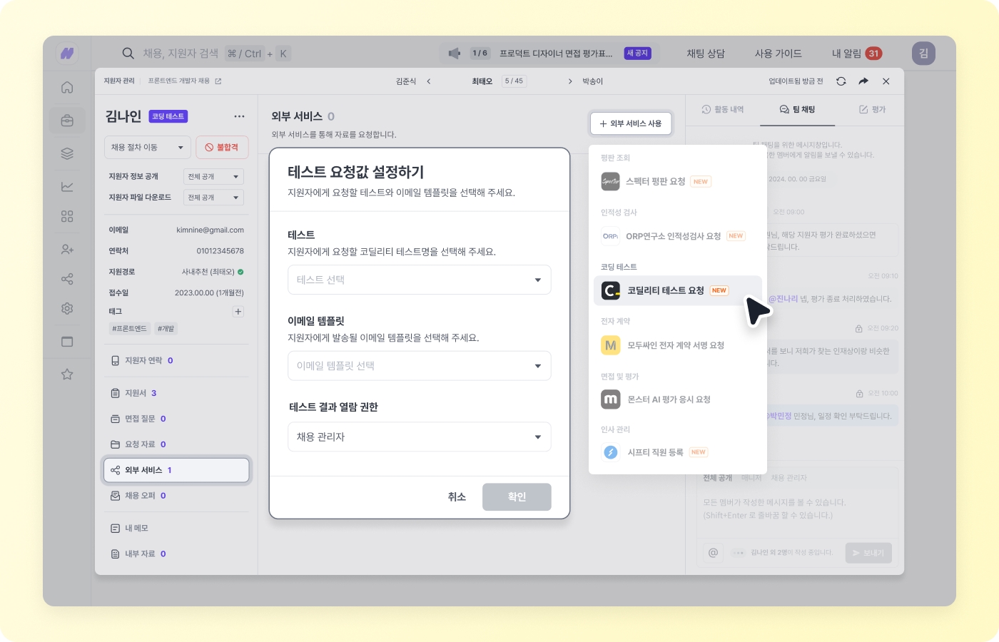 서비스 연동이 완료되면, 지원자 상세 보기 화면에서 개별 지원자에게 코딩 테스트를 요청할 수 있습니다. 지원자 상세 보기 > 외부 서비스 에서 [+ 외부 서비스 사용] 을 클릭하여 코딜리티의 코딩 테스트를 이용하세요. 이때 지원자에게 요청할 테스트와 이메일 템플릿, 결과 열람 권한을 설정할 수 있어, 보다 간편하고 테스트를 진행할 수 있습니다.