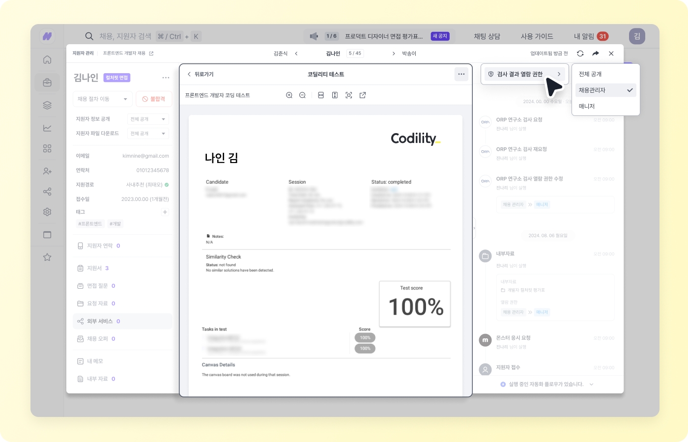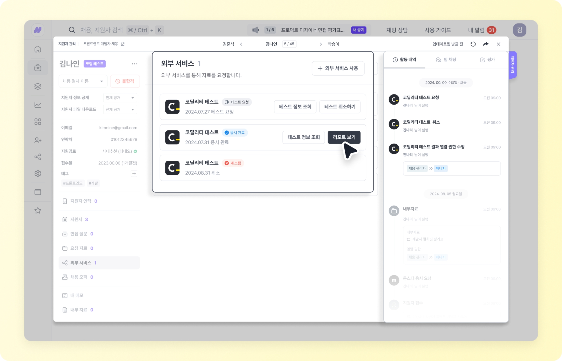 지원자에게 코딩 테스트 요청을 완료한 후에는, 지원자 상세 보기 > 외부 서비스 에서 실시간으로 지원자의 코딩 테스트 진행 상황을 확인할 수 있습니다. 또한, 활동 내역을 통해 테스트 요청, 테스트 취소, 열람 권한 수정 등의 기록을 쉽게 확인할 수 있습니다.