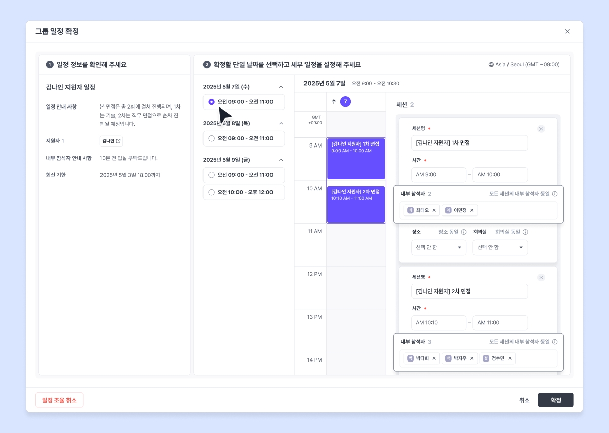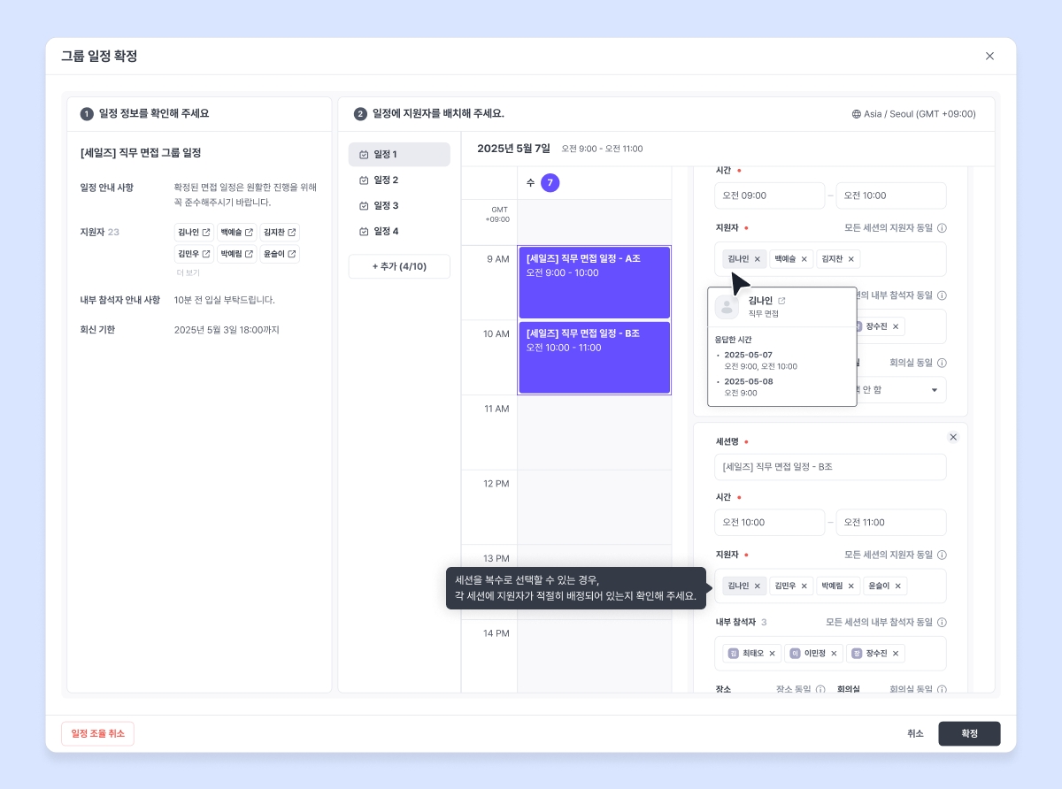 일정 확정 방법은 ‘세션 다중 선택’을 권장합니다. 이 방식은 지원자가 여러 세션을 복수로 선택할 수 있어,