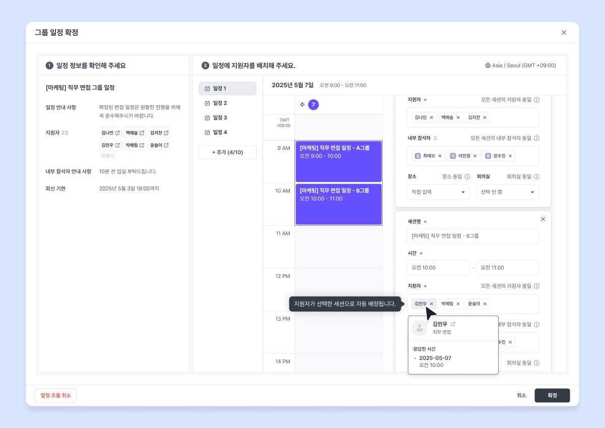 면접을 진행할 개별 지원자를 선택해 그룹 면접 일정 조율을 시작합니다.