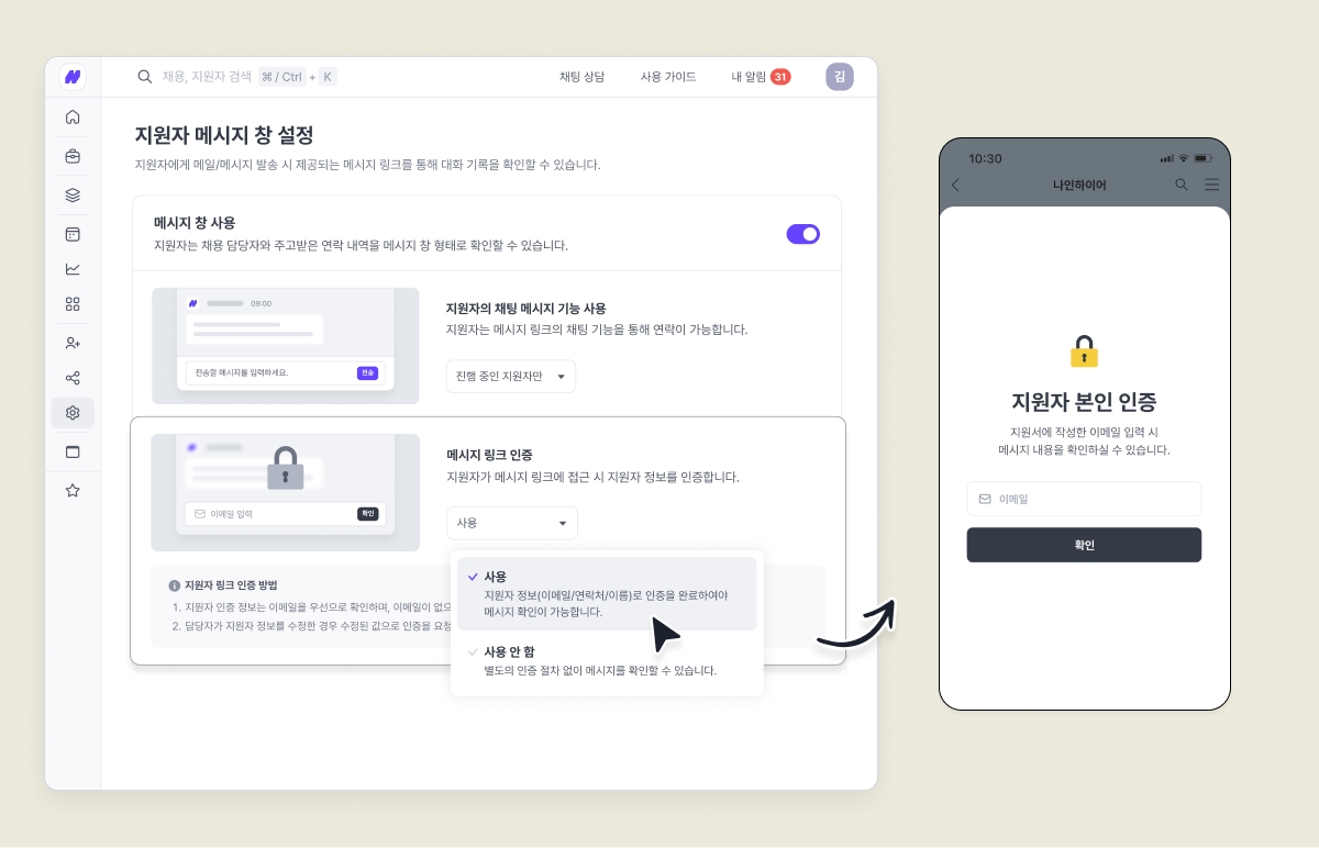 지원자와 실시간으로 소통할 수 있는 채팅 메시지 기능의 설정이 더욱 정교해졌습니다. 이제 ‘모든 지원자’, ‘진행 중인 지원자만’, ‘사용 안함’ 중 원하는 방식으로 메시지 기능을 설정할 수 있습니다. 또한, 지원자가 메시지 링크에 접근할 때 인증 절차를 거치도록 설정할 수 있어 보안도 한층 강화되었습니다.