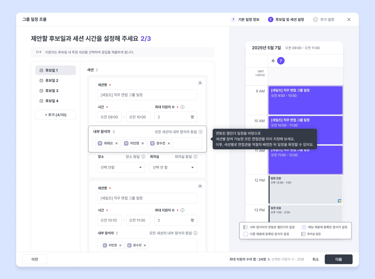캘린더 뷰를 통해 면접관의 연동된 캘린더 일정을 확인하고, 그에 맞춰 세션별 시간을 지정합니다.