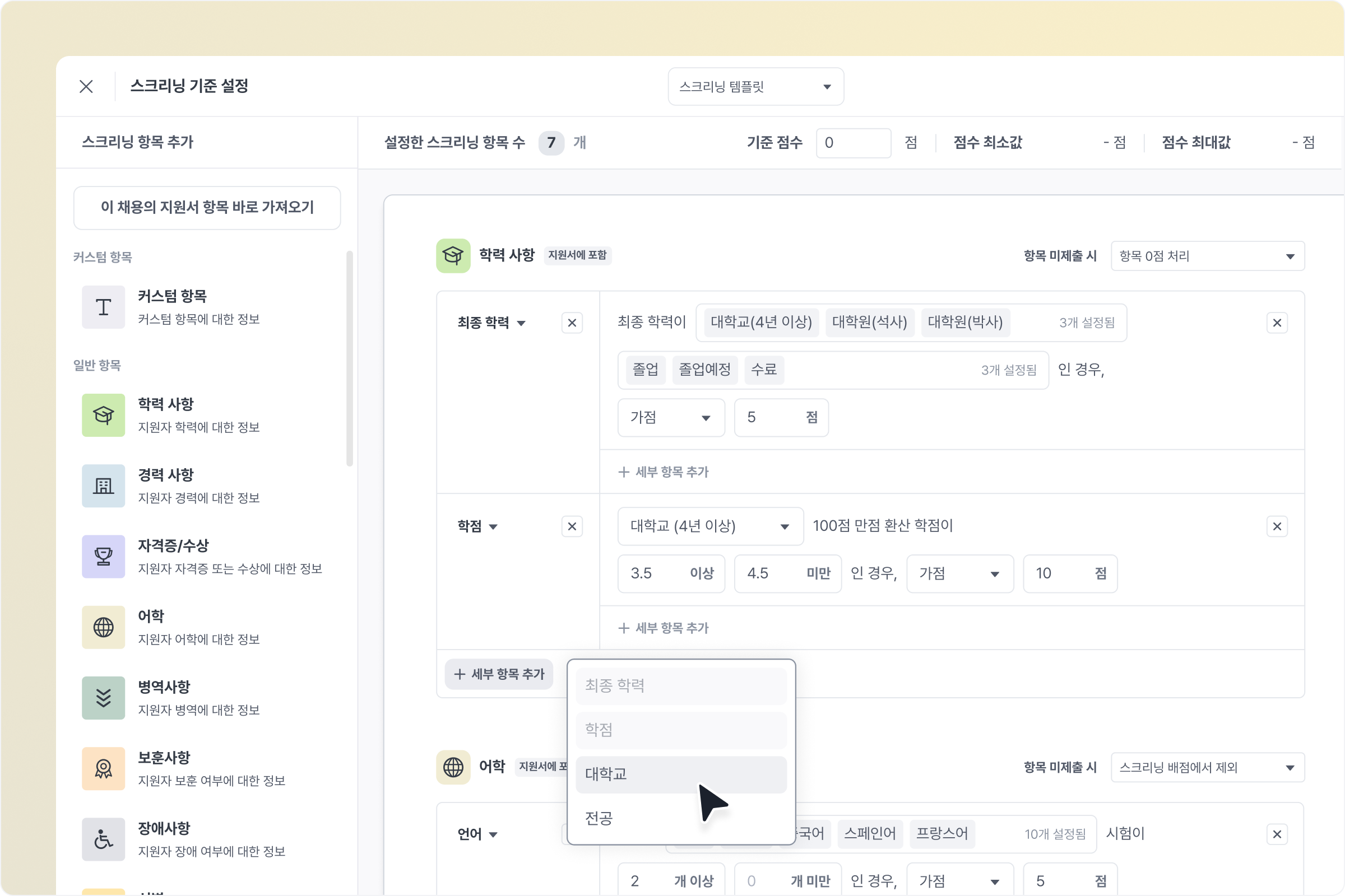 가점감점0점 처리등 배점 조건을 설정할 수 있어요.예) ‘자격증 보유 시 +2점’, ‘고졸 이하 학력 시 -1점’, ‘자기소개서 미제출 시 0점’ 등