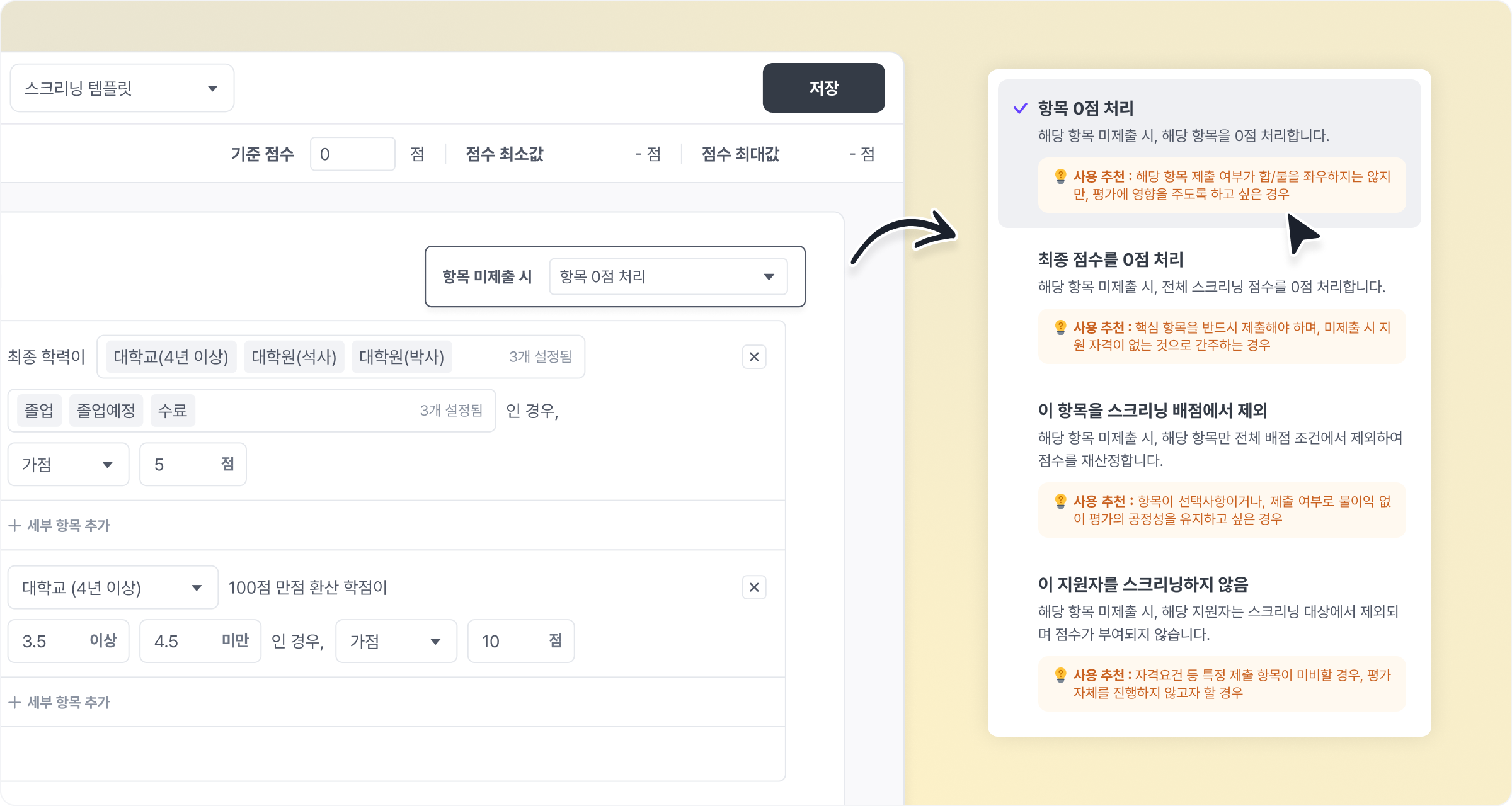 0점 처리최종 스크리닝 점수를 0점 처리배점에서 제외지원자 스크리닝 중단하도록 할 수 있어요.