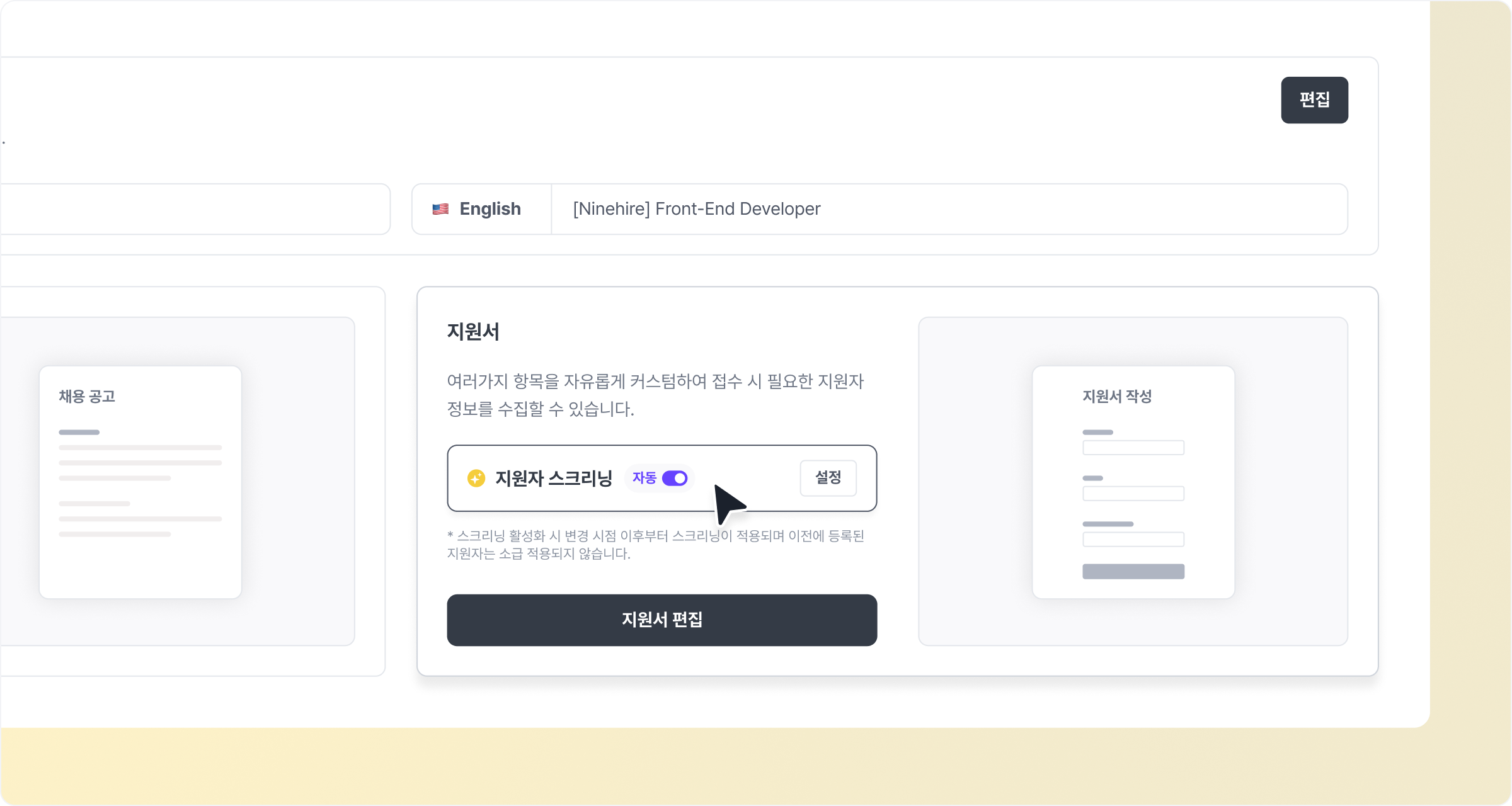 채용 관리 > 모집 공고에서 지원자 스크리닝을 자동으로 켜두면, 접수된 지원자는 설정한 조건에 맞춰 자동으로 점수가 부여돼요.