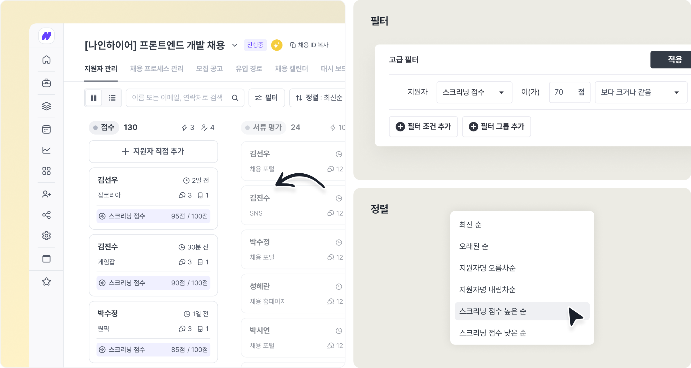 지원자 스크리닝 점수에 따른 정렬, 필터링, 자동화