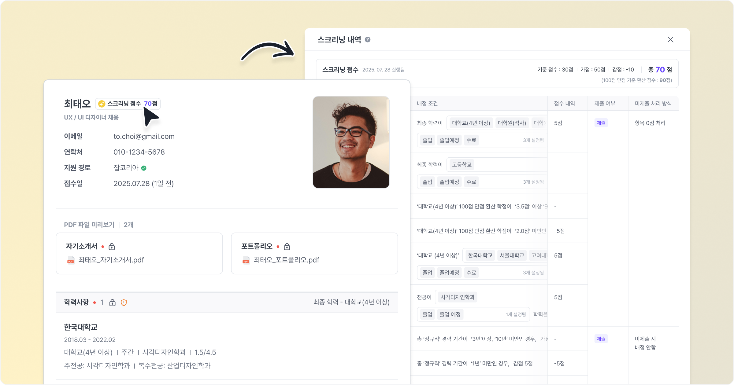 지원자 상세 페이지에서도 스크리닝 점수와 항목별 상세 점수를 확인할 수 있어요.
