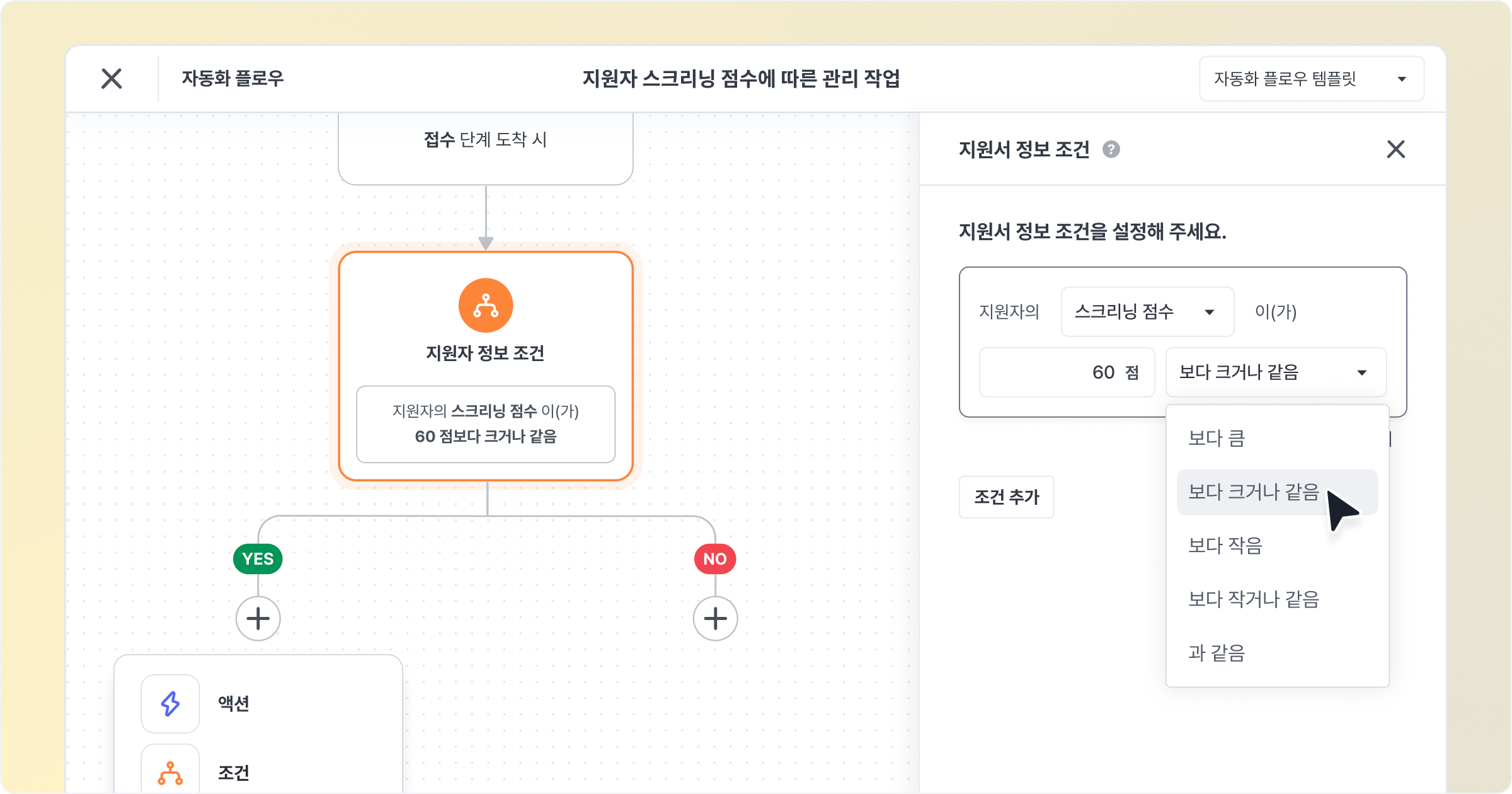 자동화 플로우 > 지원자 정보 조건에서 스크리닝 점수를 기준으로 지원자를 분류하고, 이후 다양한 액션을 자동으로 진행할 수 있어요.