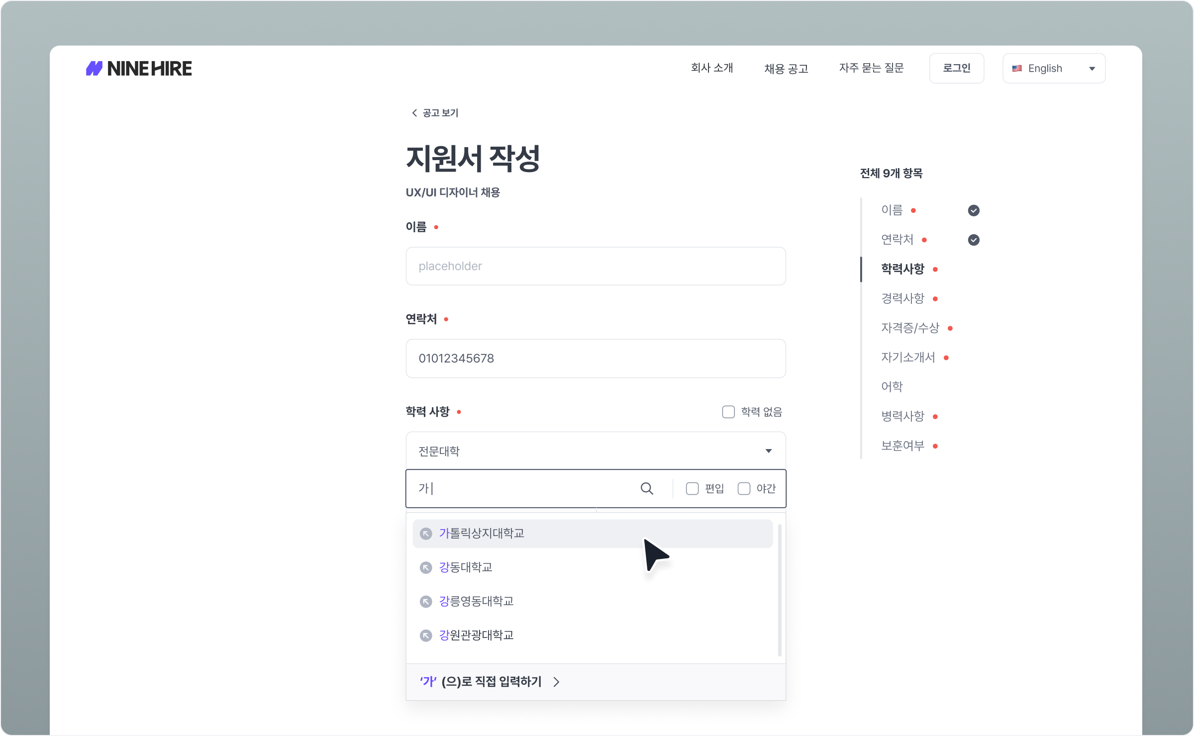 자기소개서, 학력, 경력 등 지원서의 다양한 항목에 대해