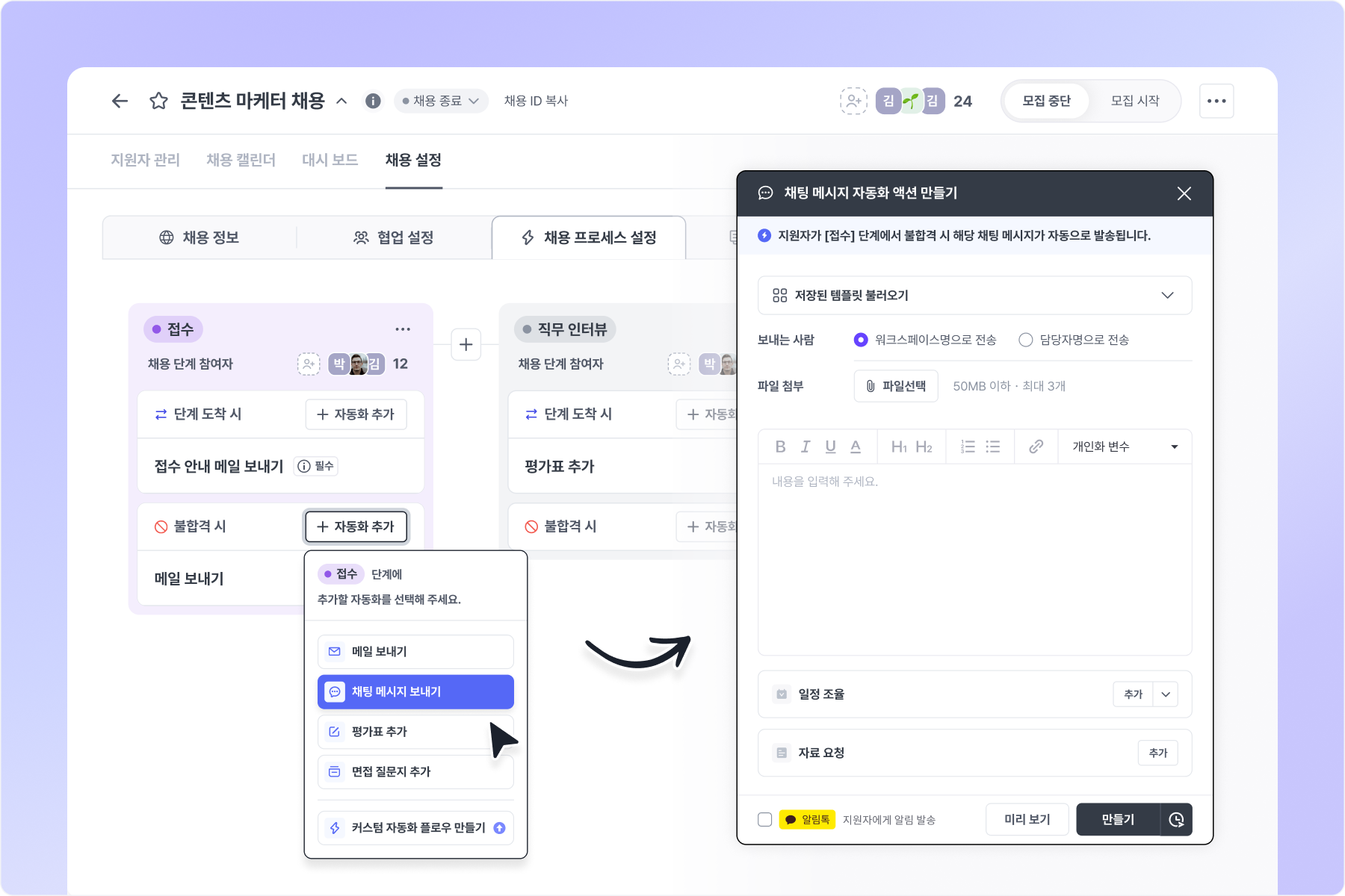 자동화 액션은 지원자가 단계에 도착하거나 불합격되는 시점에 맞춰 실행됩니다.