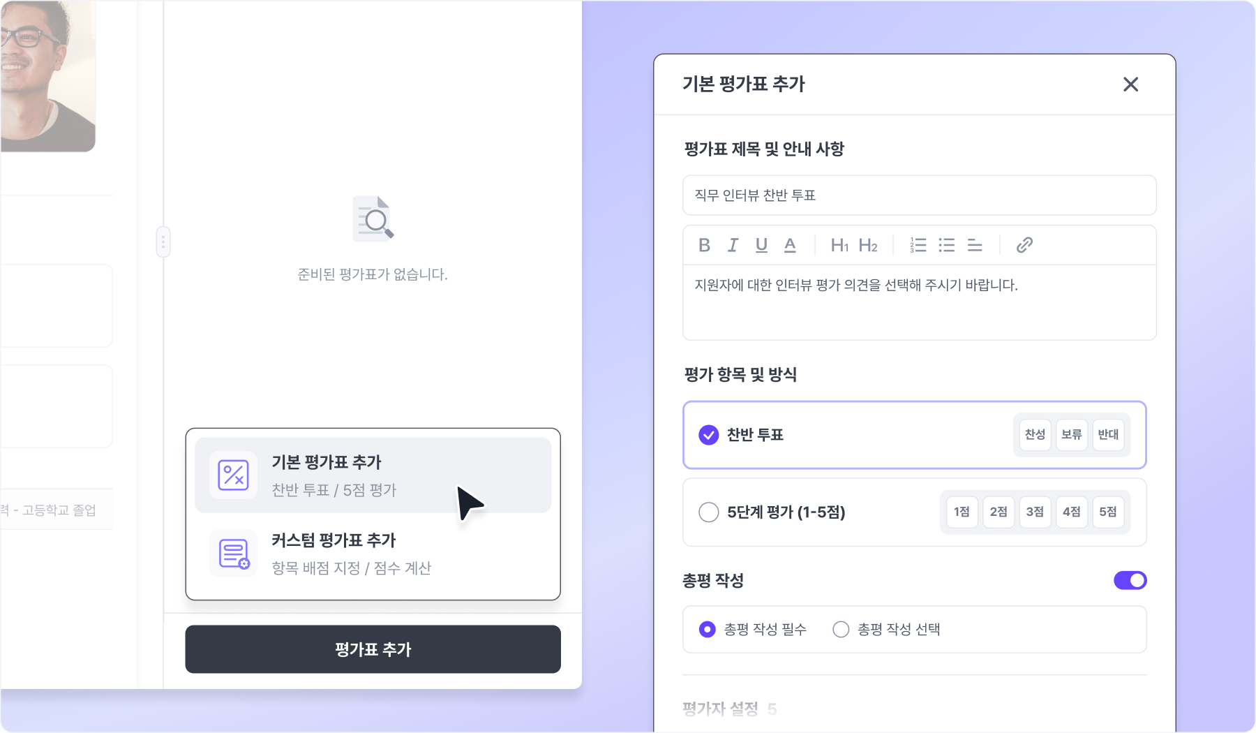 기본 평가표는 찬반 투표와 5단계 평가(1~5점) 방식을 지원하며, 총평 작성도 가능합니다.