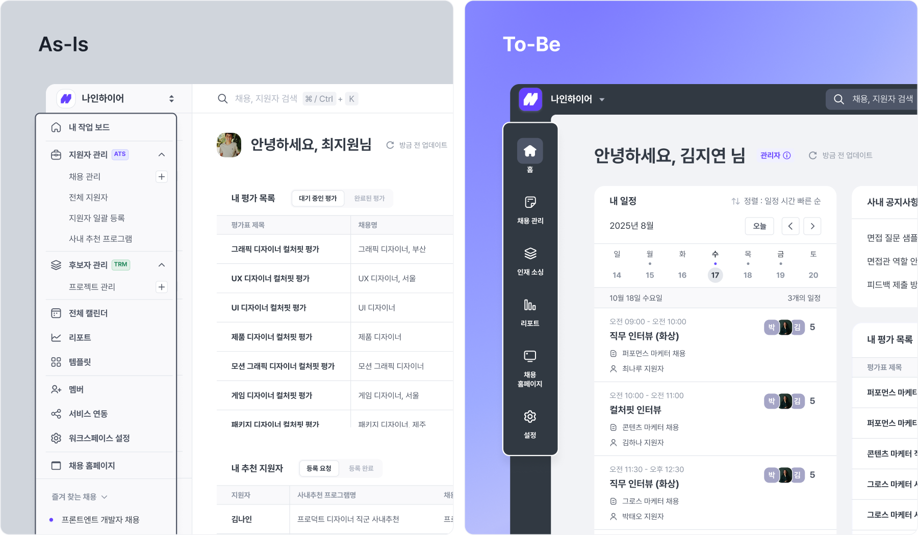 나인하이어는 고객사의 목소리와 실제 사용자 테스트 결과를 바탕으로, 더 직관적이고 편리한 경험을 제공하기 위해 UI/UX를 개선했어요. 풍부한 기능은 만족스럽지만 다소 복잡하다는 의견을 반영해, 실제 업무 흐름과 유사한 사용성을 구현했어요. 덕분에 필요한 작업을 더 빠르게 처리할 수 있고, 처음 사용하는 분들도 부담 없이 적응할 수 있어 신규 팀원의 온보딩 시간도 줄어듭니다.