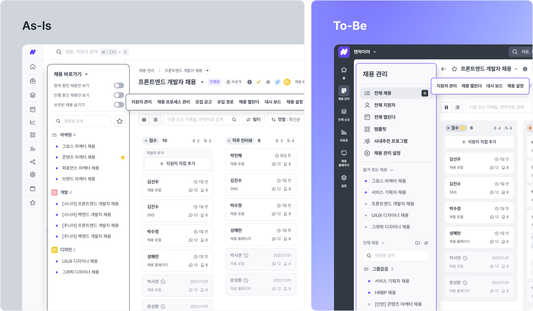 채용 관리 화면의 좌측 사이드바에서 개별 채용에 바로 접근할 수 있고, 업무 관련성과 사용 빈도에 맞춰 첫 화면의 정보와 탭 구성을 간소화했어요. 사용 경험은 더 간결해지고, 채용 관리 효율도 함께 개선되었습니다.
