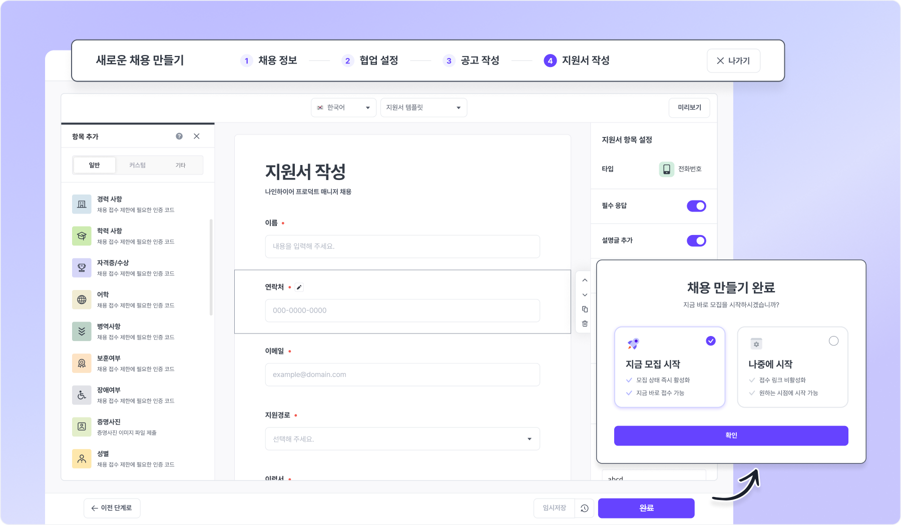 이제는 흩어져 있던 설정을 한 흐름에서 처리할 수 있어, 이곳저곳 이동하지 않고도 모집 준비를 더 쉽고 빠르게 완료할 수 있습니다.