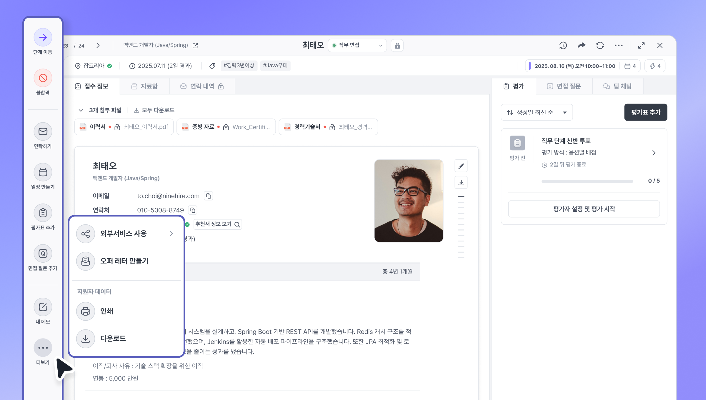 연락하기, 일정 만들기, 평가표 추가, 면접 질문 추가