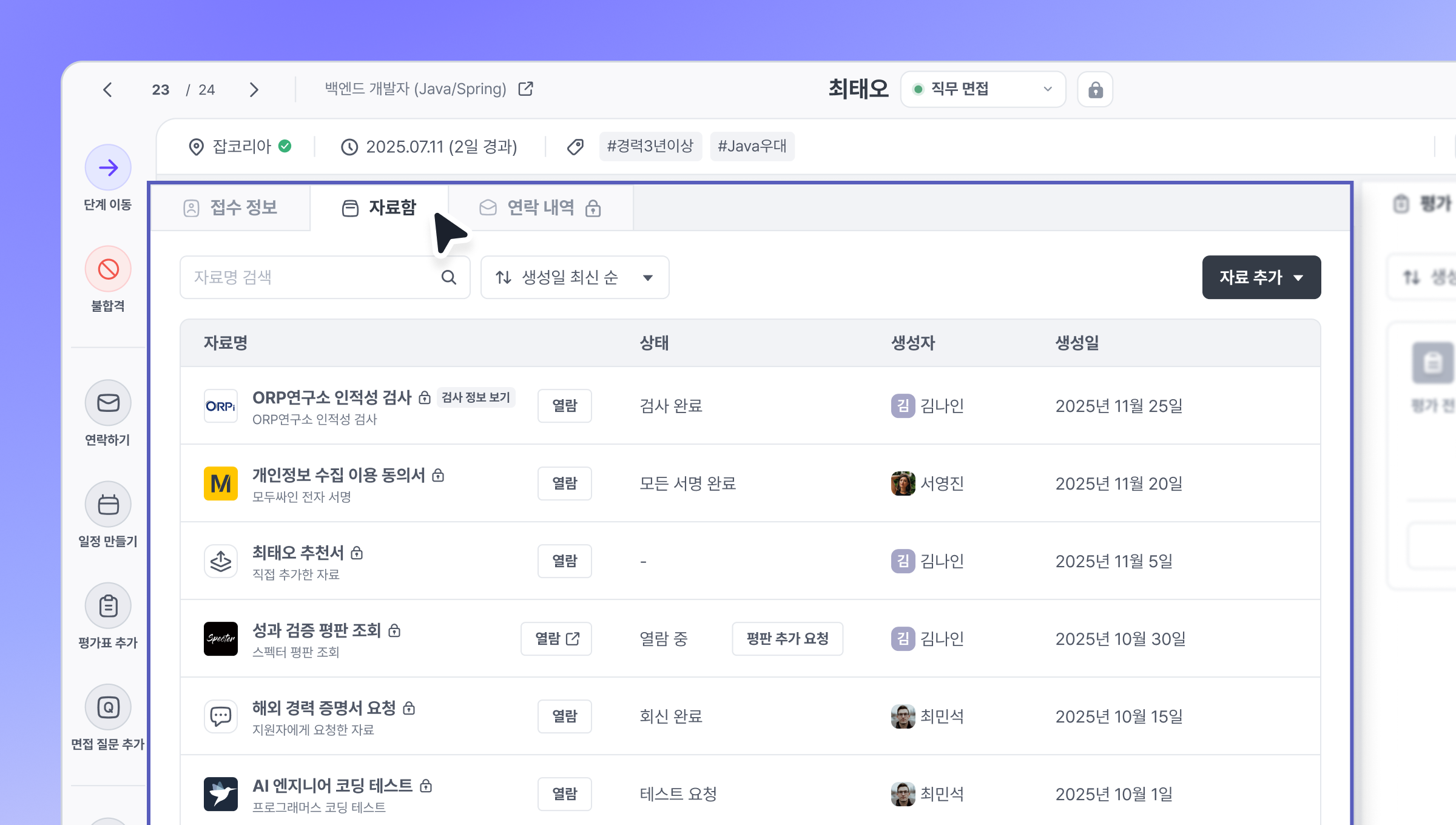 특히, 자료함의 경우 이전에는 지원자 요청 자료, 외부 서비스 관련 자료, 내부 자료 등이 서로 다른 탭에 있어 번거로움이 있었는데, 이제는 모든 자료들을 자료함에서 유형별로 구분해 한눈에 확인할 수 있게 되었습니다.