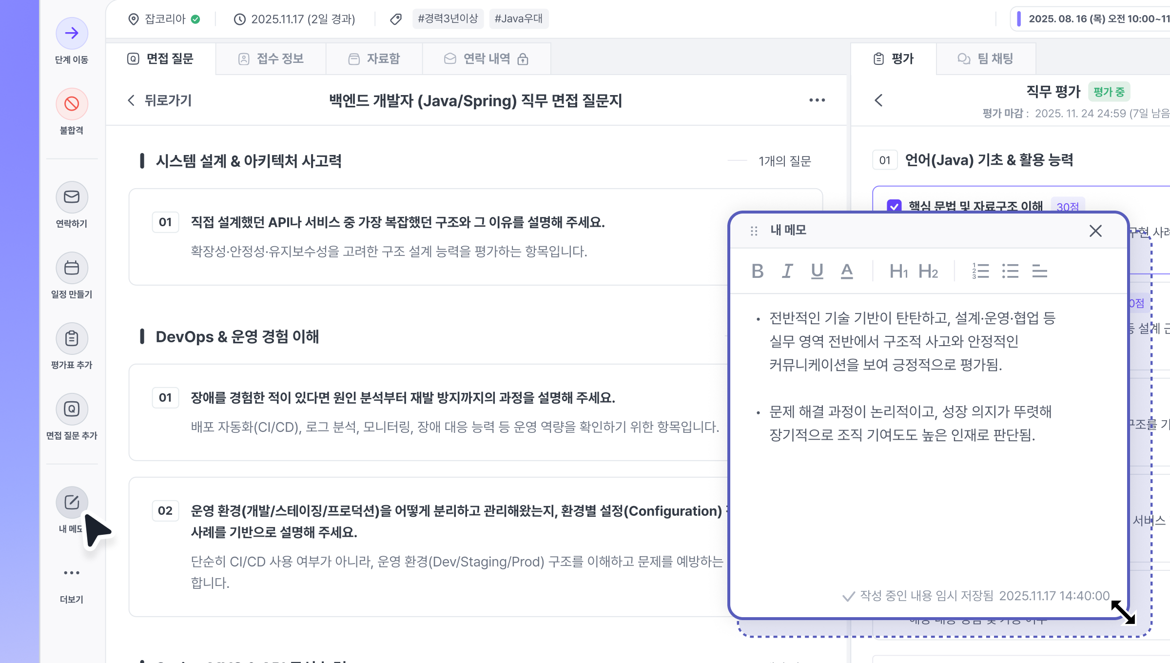 내 메모 기능을 플로팅 창으로 변경하여 접수 정보(지원서)나 면접 질문을 보면서 작성할 수 있도록 개선했어요. 내 메모 창의 위치와 크기를 자유롭게 조정할 수 있어 더욱 편리해졌습니다.