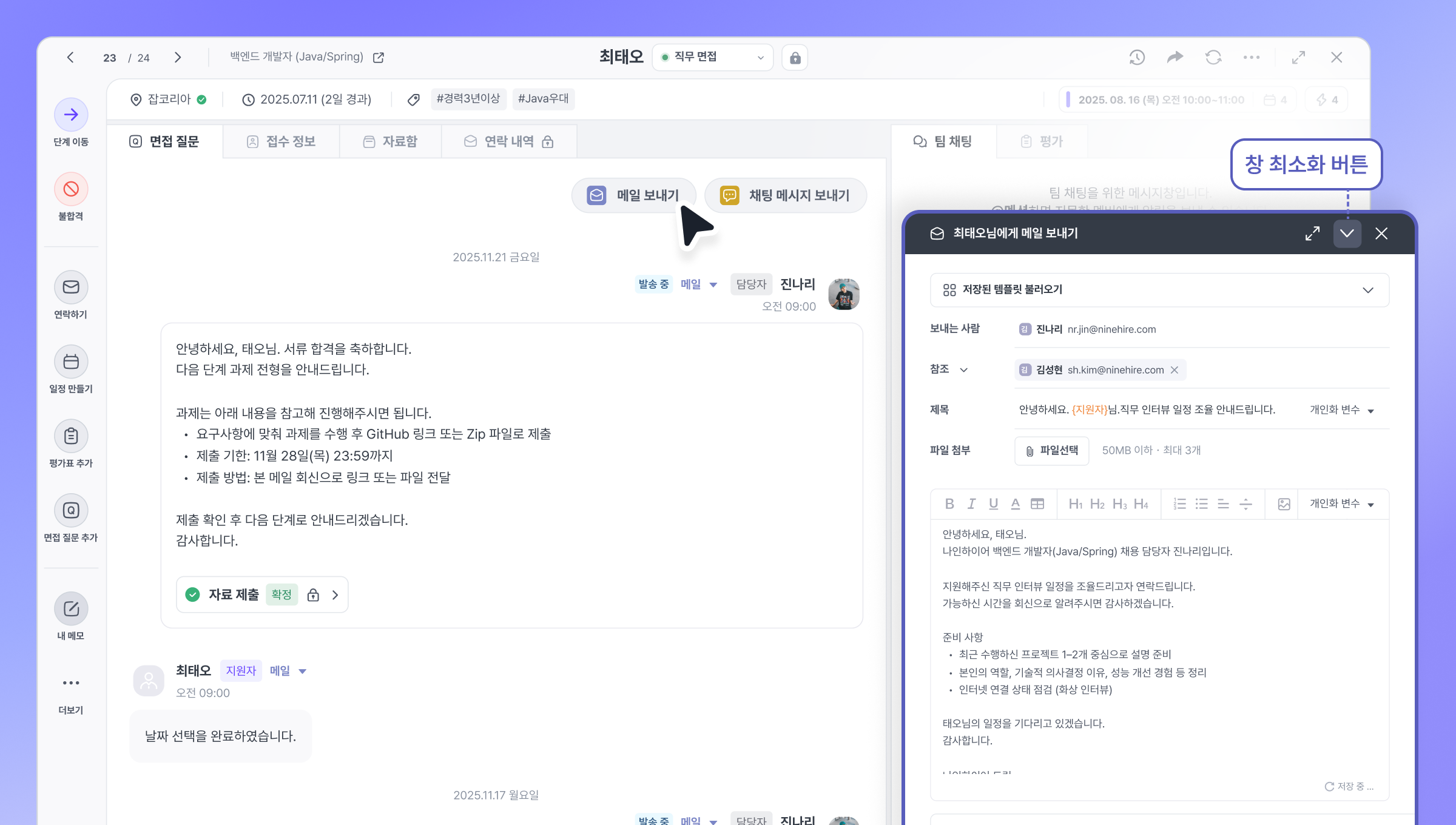 메일/채팅 메시지 발송 창이 연락 내역을 가리던 불편함을 해결하기 위해 발송 창의 위치를 조정했습니다. 더불어, 발송 창을 최소화할 수 있는 기능도 마련하여 사용 편의성을 높였습니다.