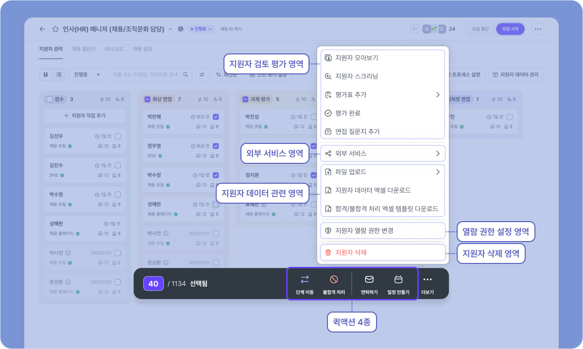 채용 업무에서 자주 활용되는 지원자 단계 이동, 불합격 처리/불합격 취소, 연락하기, 일정 만들기 버튼은 보다 빠르게 사용할 수 있도록 뎁스를 줄였습니다. 또한 원하는 액션을 보다 쉽게 찾을 수 있도록 상호 연관성을 고려해 새롭게 그룹핑했습니다.