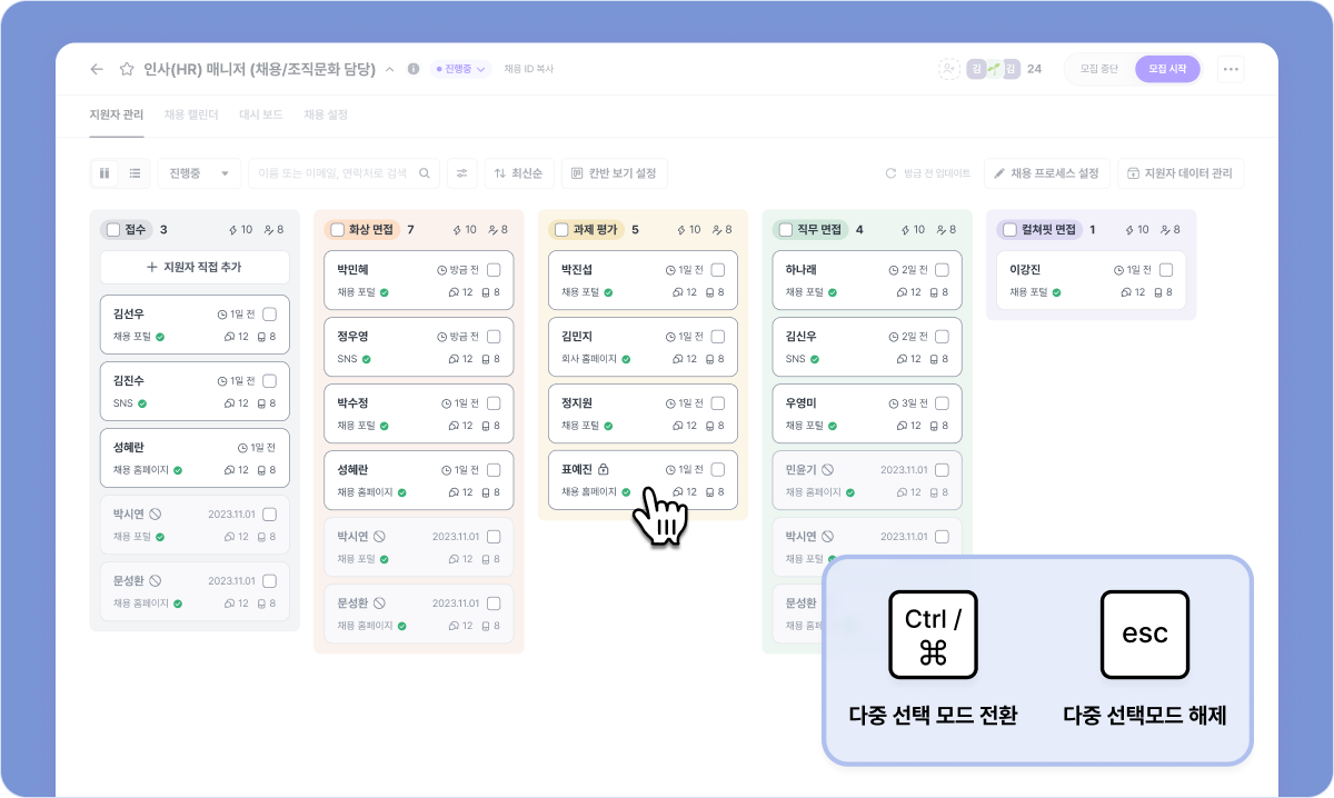 또, 칸반보드 뷰에서도 이제 단계 범위를 넘어 지원자를 다중 선택할 수 있게 개선되었어요.