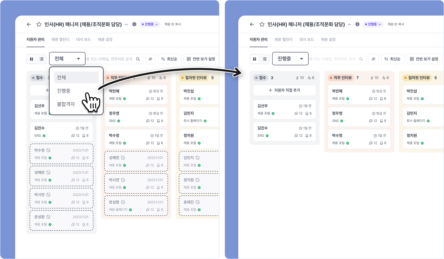 나인하이어 지원자 상태는 진행 중, 불합격, 최종 합격 상태로 나뉘고, 지원자를 상태별로 모아보고 싶을 때가 많습니다. 특히 진행 중인 지원자만 칸반에서 빠르게 구분하여 보고 싶다는 개선 의견이 많았는데요.