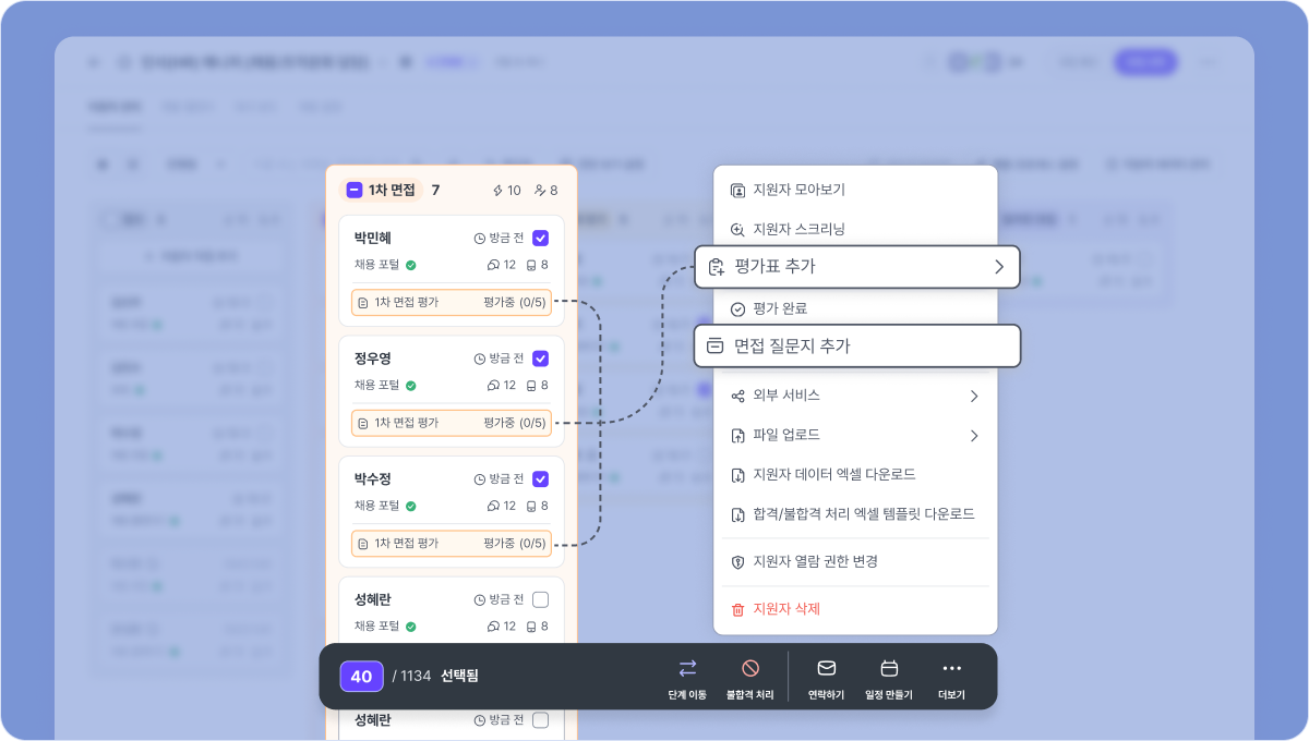 지원자 다중 선택 엑션에 평가표 추가, 면접 질문지 추가, 지원자 삭제 액션을 추가했습니다.