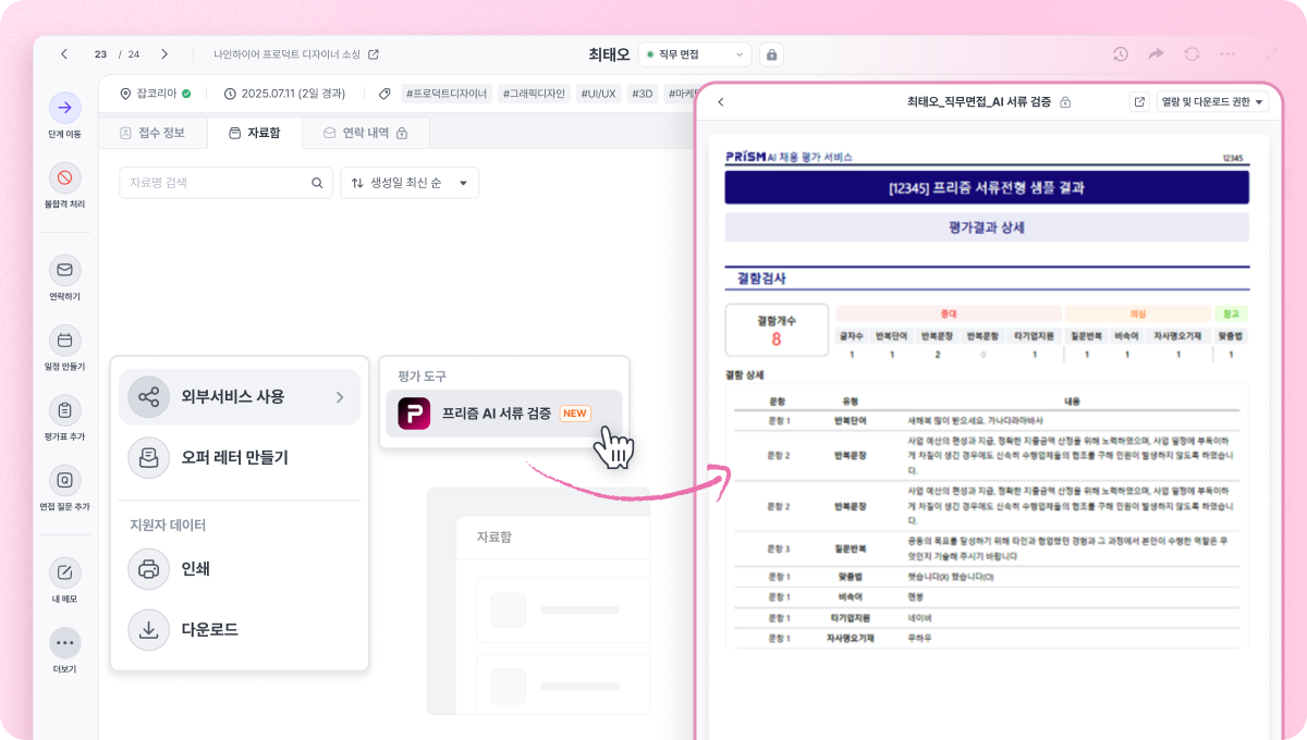 나인하이어에 무하유 프리즘(AI 서류 검증) 연동 기능이 추가되었습니다. AI 서류 검증을 통해 초기 검토 시간을 줄이고 기업에 적합한 인재를 스크리닝할 수 있습니다.