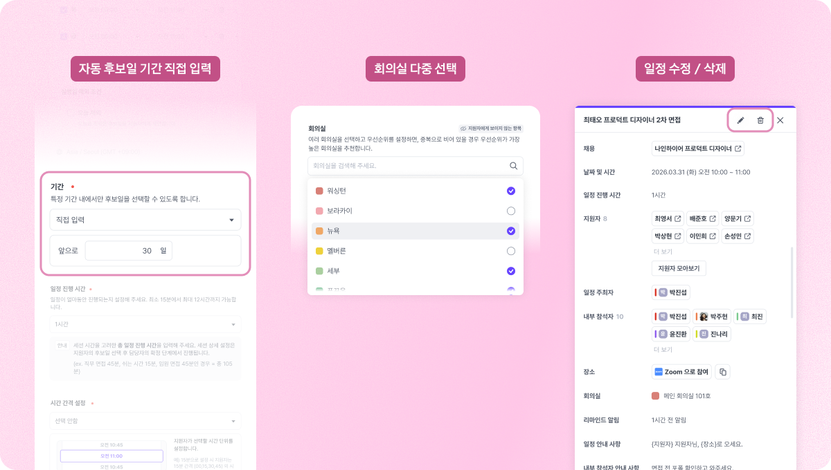 일정 조율 과정에서 반복적으로 수집된 요청 사항을 반영해 기능이 개선되었습니다. 이제 회의실 다중 선택, 후보일 기간 직접 설정, 지원자 상세 화면에서의 일정 변경 및 삭제가 가능합니다.