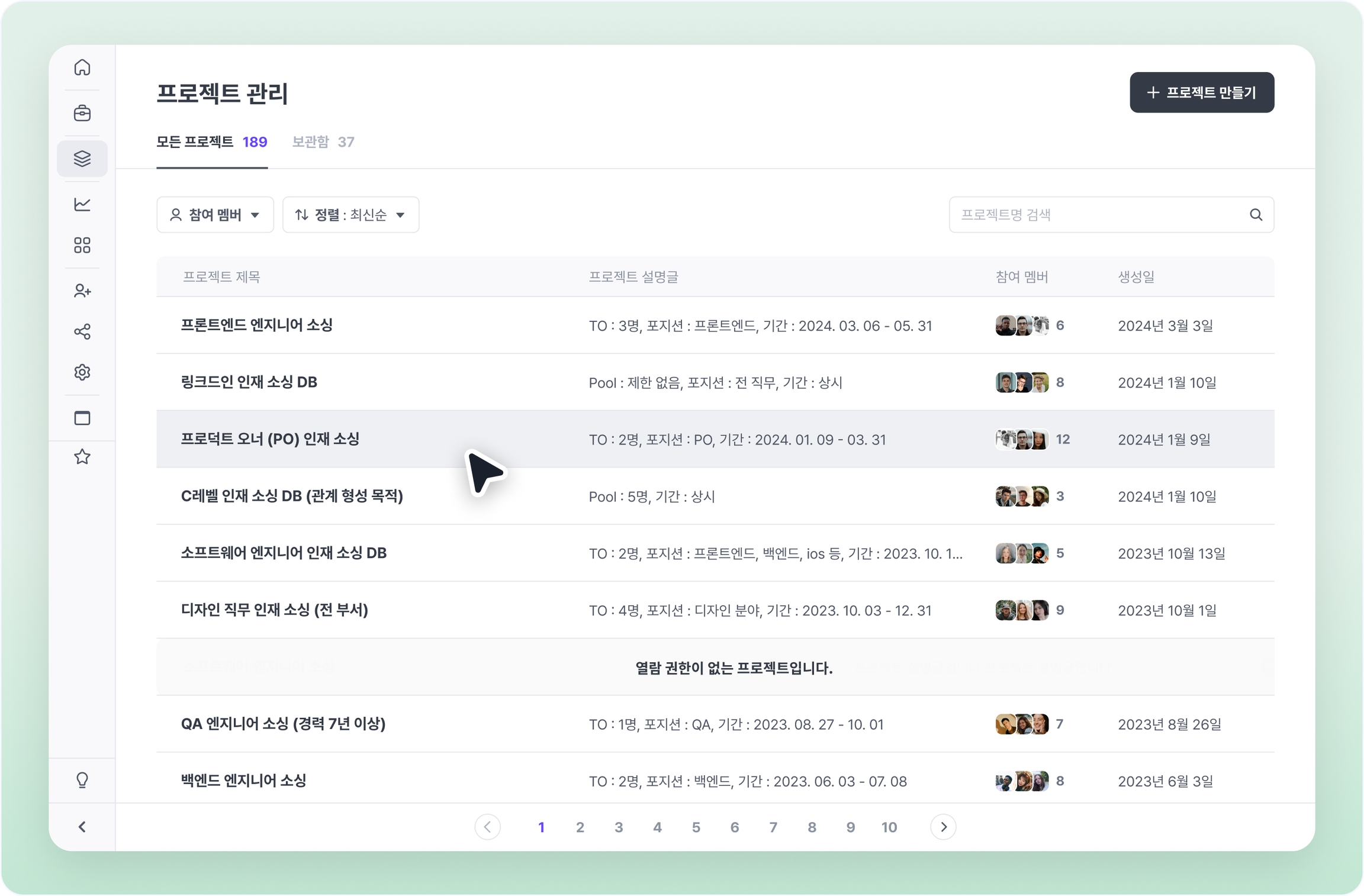 소싱할 포지션에 대한 아웃바운드 채용 목표를 바탕으로 프로젝트를 구성하고 관리해 보세요. 포지션에 따라 목표로 하는 인원과 기간을 정해 기록하고, 프로젝트 관리를 함께할 멤버들을 초대할 수 있습니다.