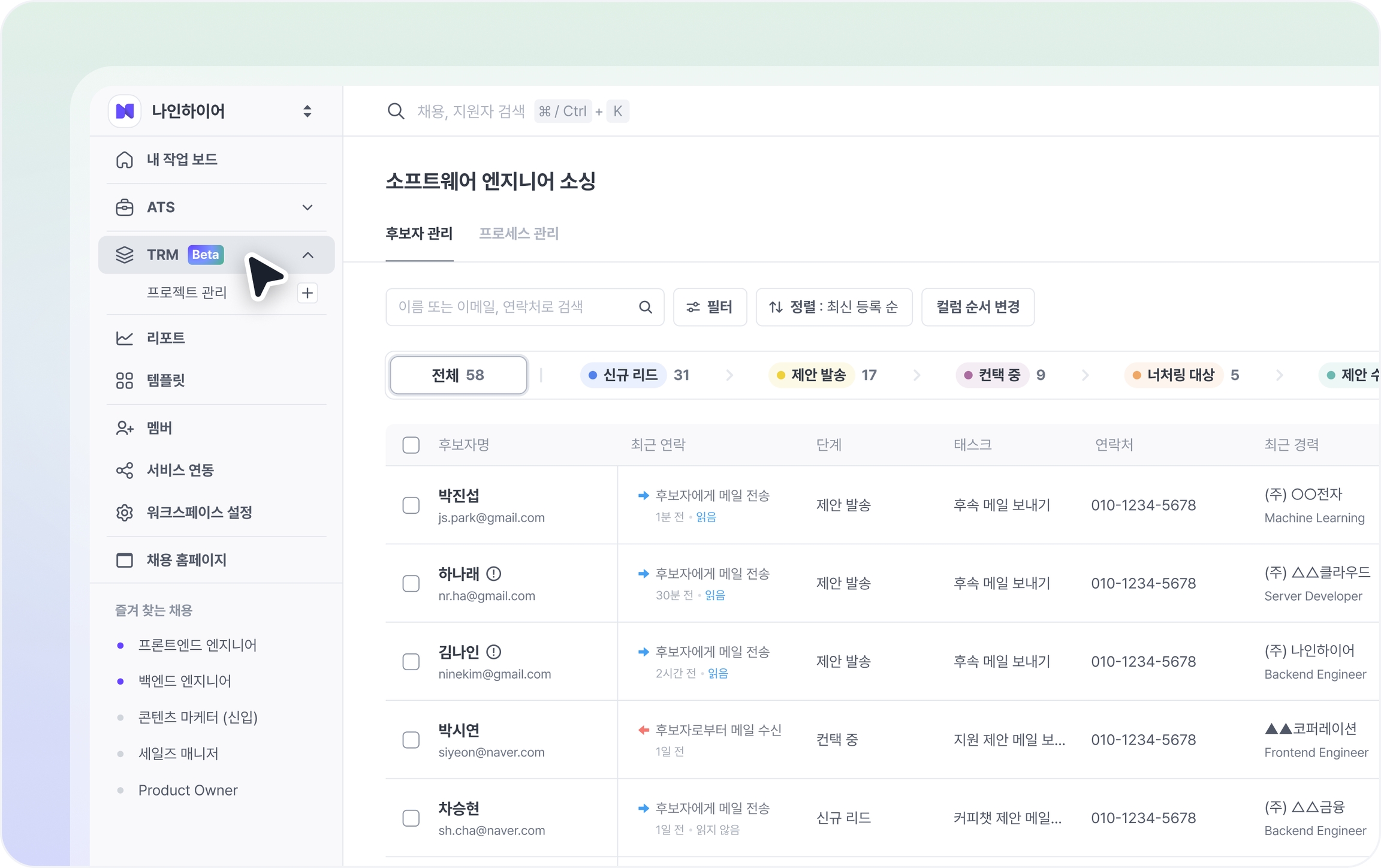 핵심 인재를 확보하기 위한 최적의 솔루션, 나인하이어 TRM이 베타로 출시되었습니다. 아웃바운드 채용 전략에 관심이 있지만, 채용 속도 때문에 망설이고 계신가요? 걱정하지 마세요. 다양한 채널을 통해 후보자를 손쉽게 발굴하고, 지속적이고 효과적인 커뮤니케이션을 통해 후보자와의 관계를 체계적으로 관리될 수 있도록, 프로젝트/후보자풀/히스토리/태스크까지 나인하이어가 지원해드릴게요.