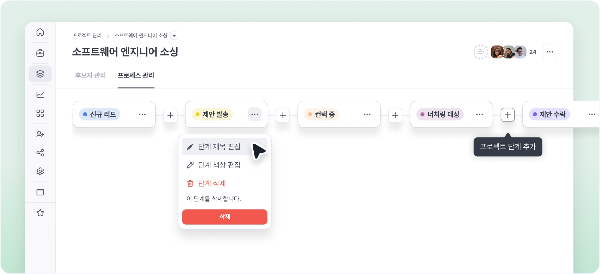각 프로젝트에 맞춰, 후보자를 효과적으로 관리할 수 있는 프로세스를 손쉽게 구축할 수 있어요. 현재 후보자와의 관계 상태나 진행 상황을 기준으로 단계를 설계하여, 체계적인 관리 프로세스를 마련해 보세요.