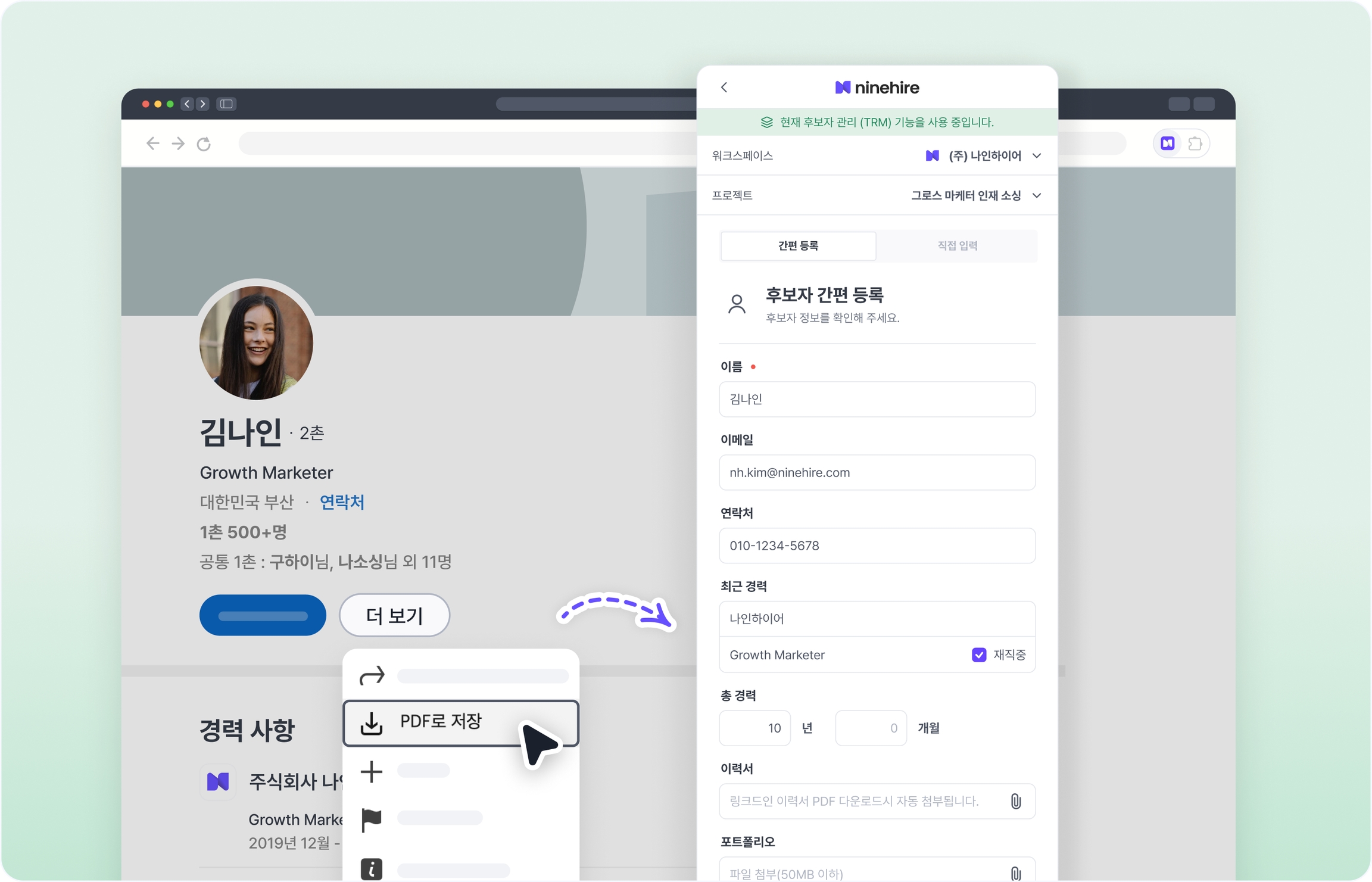링크드인에 있는 후보자 정보를 나인하이어 어시스턴트(크롬 확장프로그램)를 사용하여 원클릭으로 나인하이어에 등록할 수 있어요. 링크드인의 후보자 프로필에서 PDF 저장을 실행해 주세요. PDF 파일 내의 후보자 정보가 나인하이어 어시스턴트에 자동으로 입력되어 원하는 프로젝트에 후보자를 간편하게 등록할 수 있습니다.