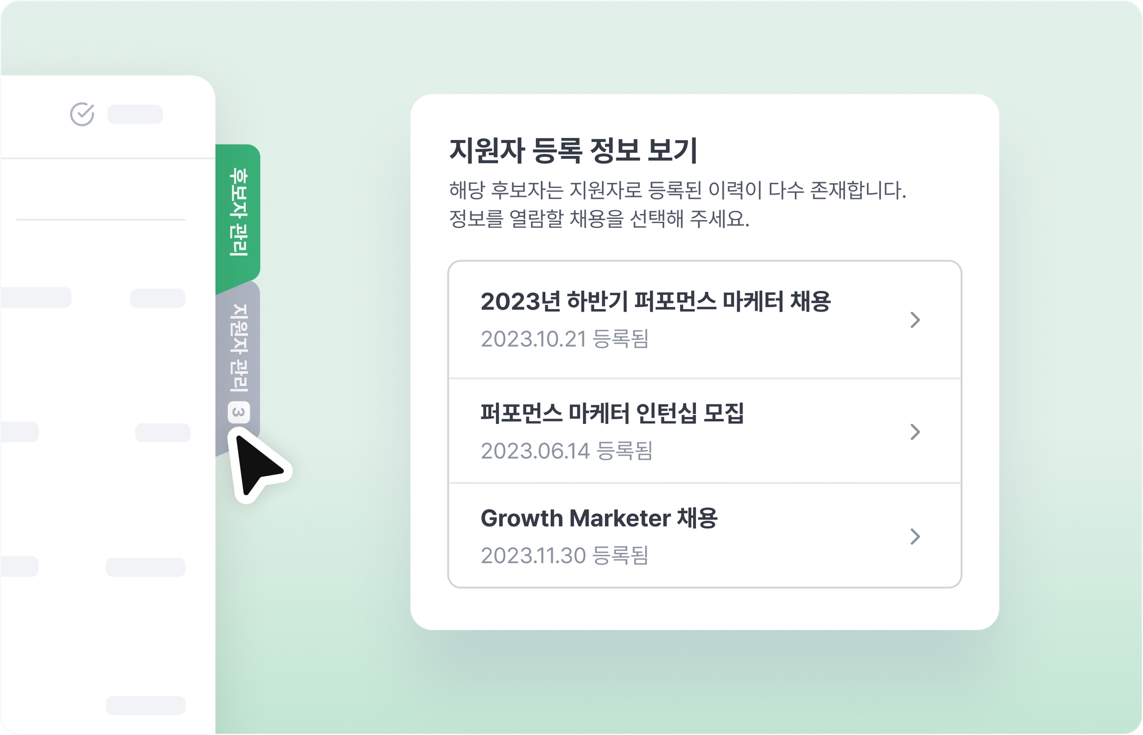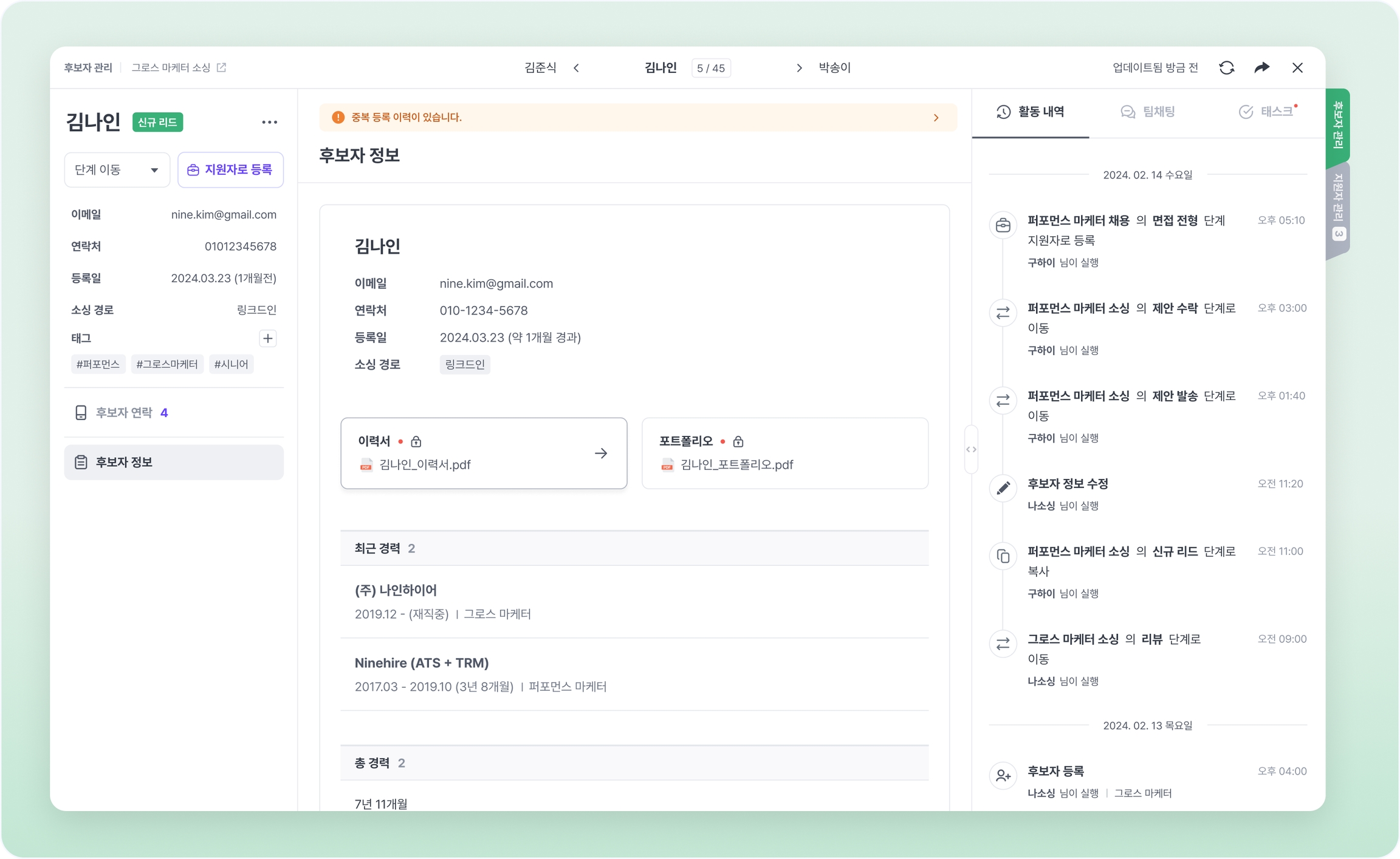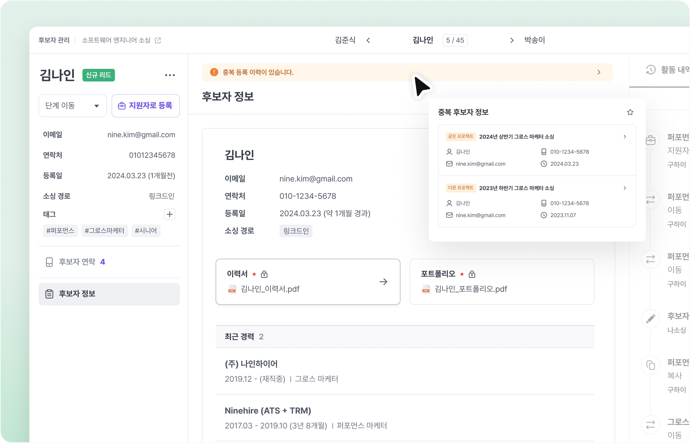나인하이어 TRM은 ATS의 데이터와 연동되어 유기적으로 작동합니다. 과거에 지원자로 등록된 이력이 있을 경우, 그 히스토리를 빠르게 확인할 수 있어요.